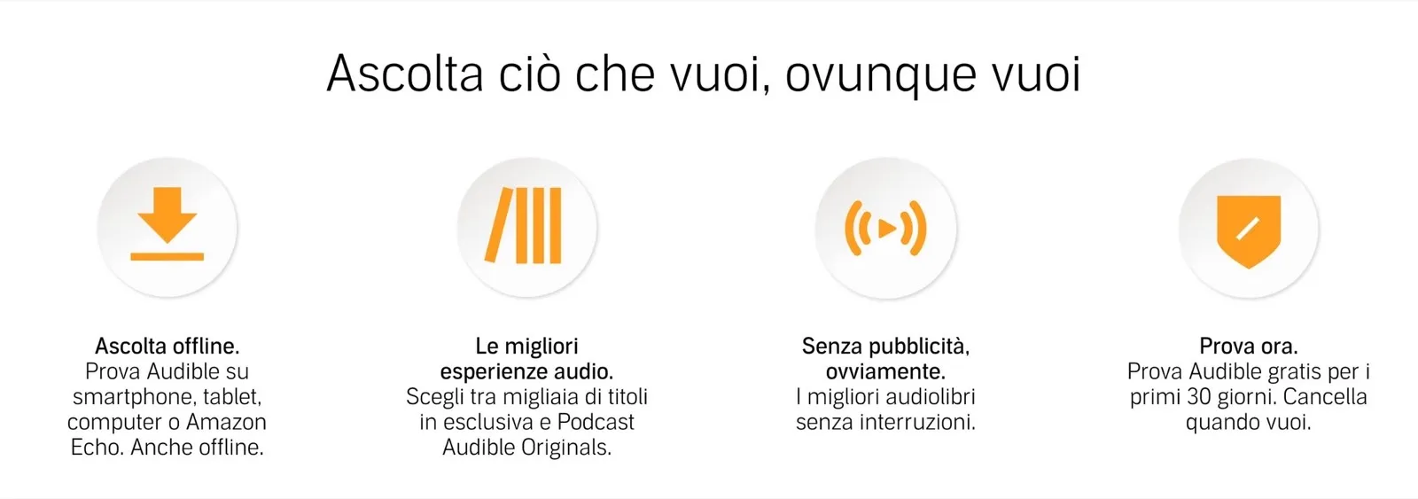 Per sottoscrivere l’abbonamento in promozione cliccate qui, effettuate l’accesso col vostro account Amazon ed iscrivetevi ad Audible (se non avete l’abbonamento a Prime, prima attivate quello partendo da qui). Dopo l’iscrizione avrete accesso immediato e illimitato a tutto il catalogo che, come dicevamo, comprende migliaia di audiolibri e podcast e vi garantirete il servizio a 0,99 € per 3 mesi invece che 9,99 € al mese.