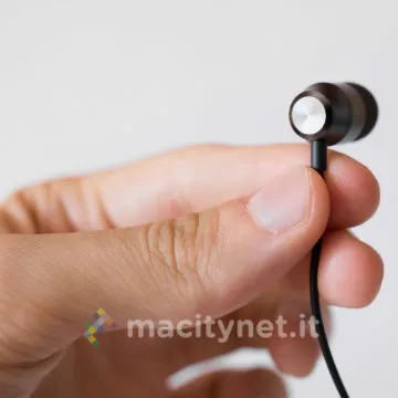 Gli auricolari sono di tipo in-ear, con gommini di varie dimensioni per adattarsi al meglio all’interno di qualsiasi cavità auricolare. Il cavo, con guaina in gomma, che collega gli auricolari al telecomando, è molto sottile, mentre aumenta di spessore quello che va dal telecomando al connettore Lightning. La cassa di quest’ultimo e degli auricolari, sono in alluminio spazzolato: dello stesso materiale è anche il telaio del telecomando, realizzato per il resto della cassa da due coperture in plastica satinata.