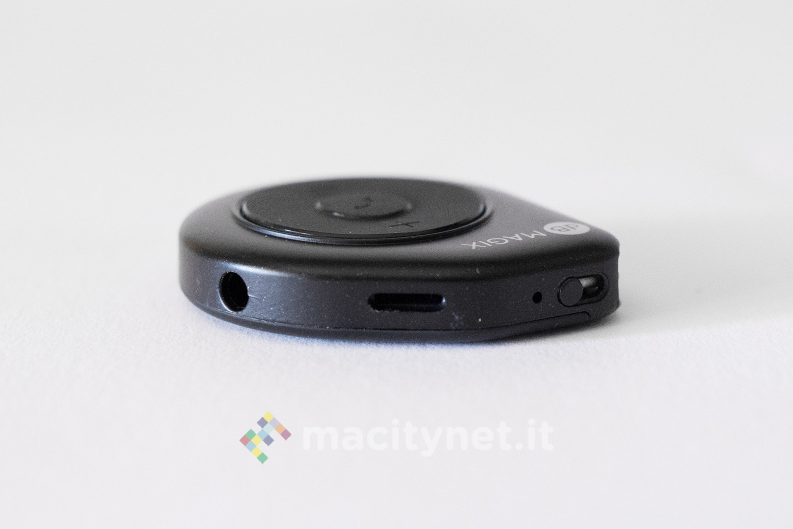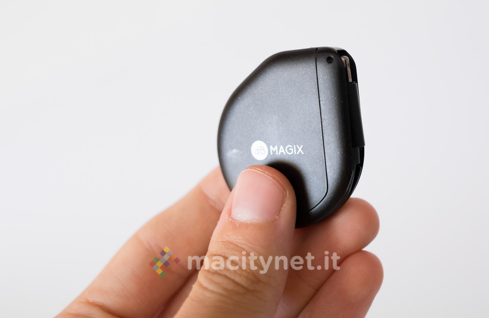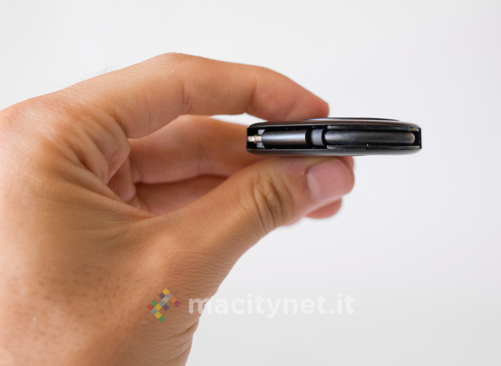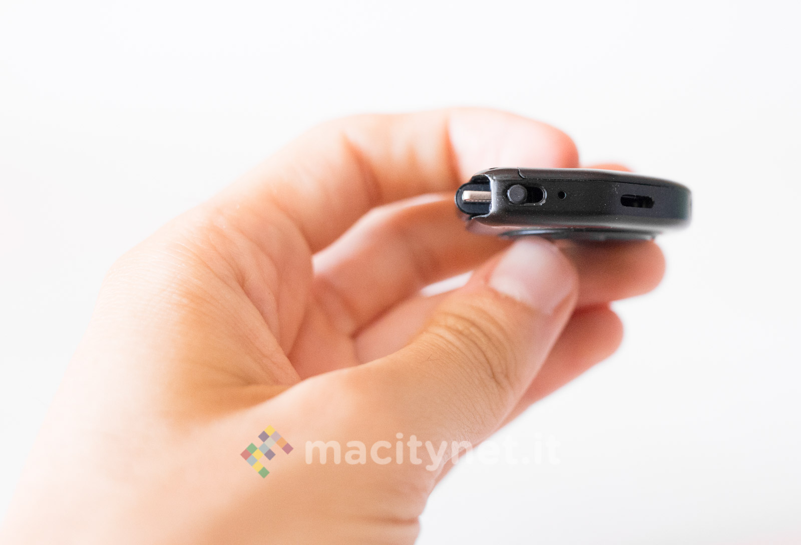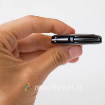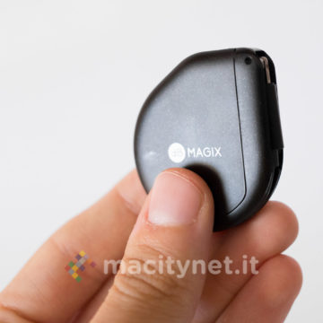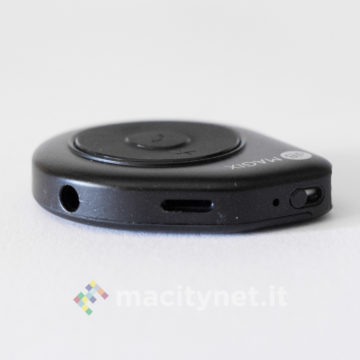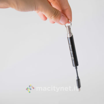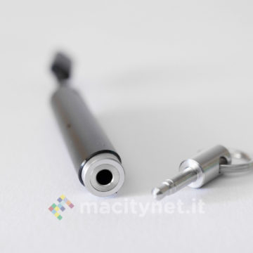 Questo adattatore è esteticamente diverso dal precedente: dalla forma “a goccia”, è realizzato interamente in plastica satinata ed è molto leggero. La spina Lightning è nascosta al suo interno e per estrarla ci si dovrà aiutare con una sorta di leva che si spinge tramite un piccolo interruttore posto lateralmente. Adiacente a quest’ultimo ci sono anche la presa jack da 3.5mm e quella Lightning per collegare il cavo di ricarica. Da un lato c’è anche un forellino per agganciarlo eventualmente a un mazzo di chiavi con un cordino (non incluso nella confezione).