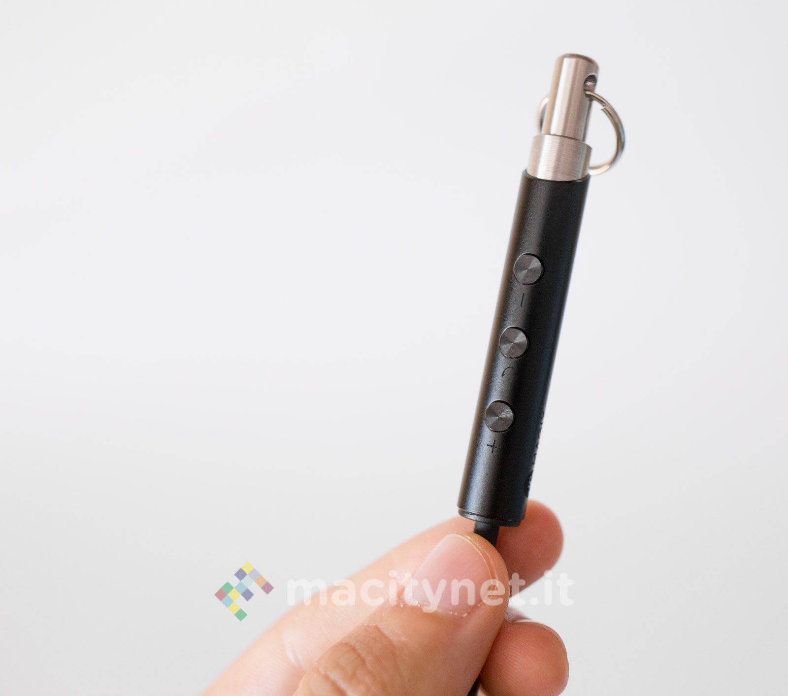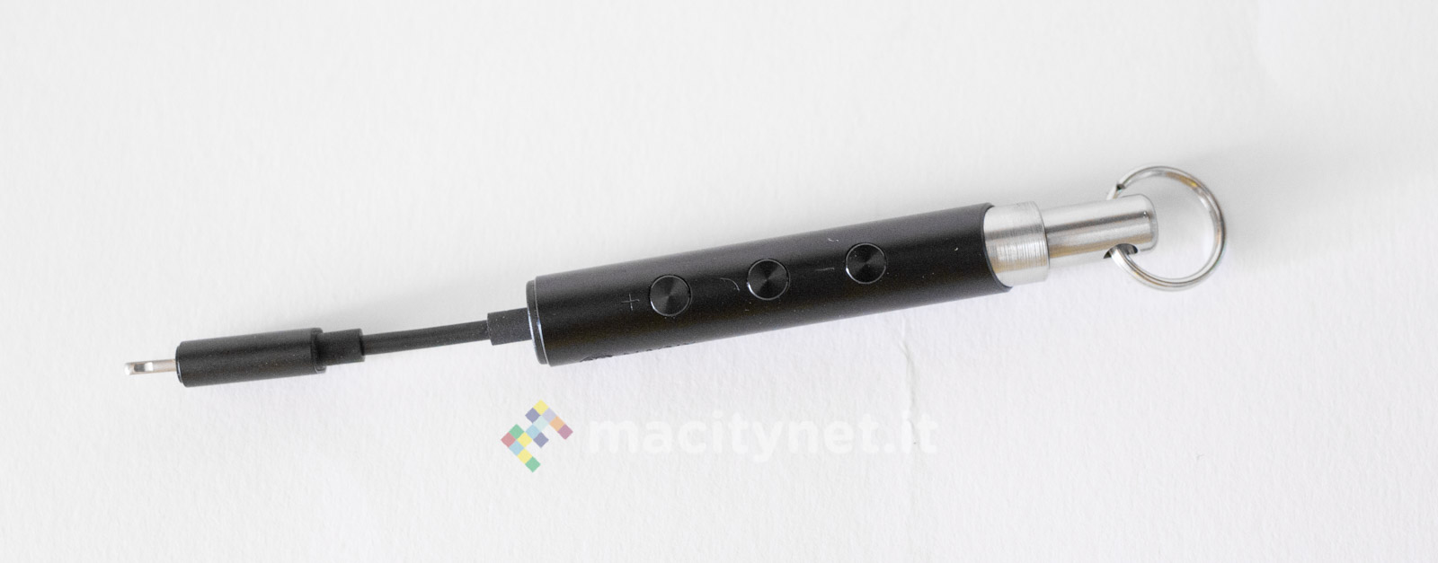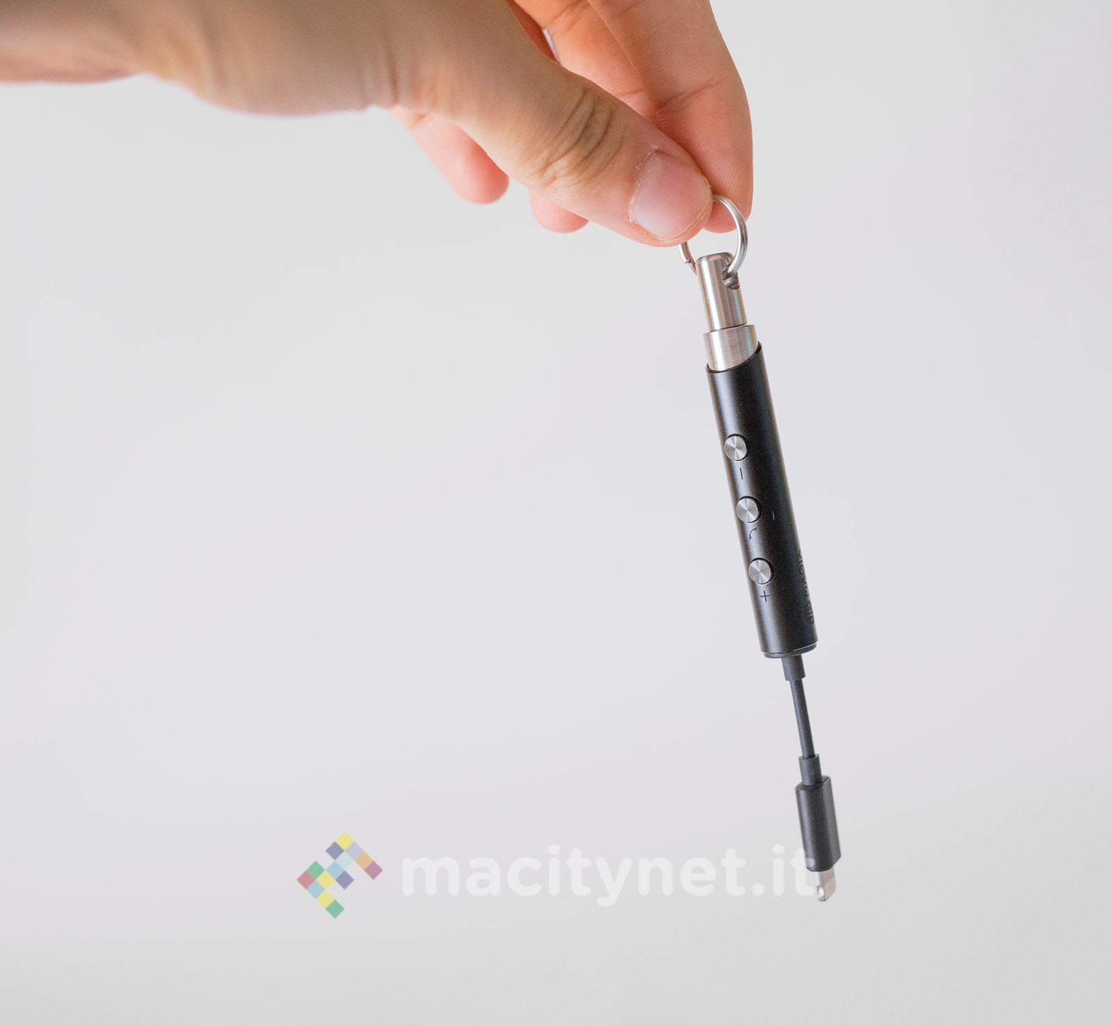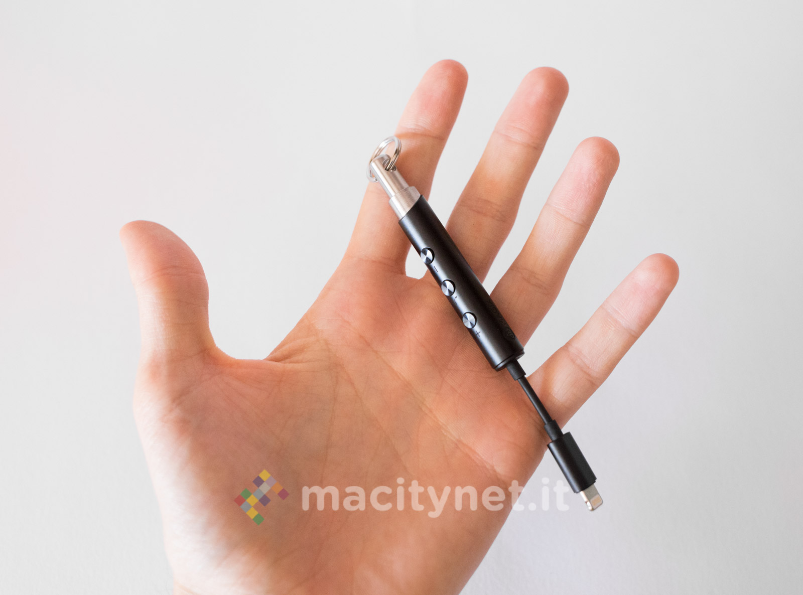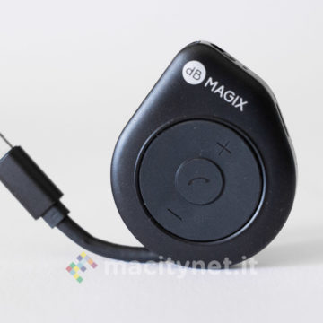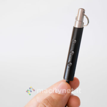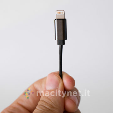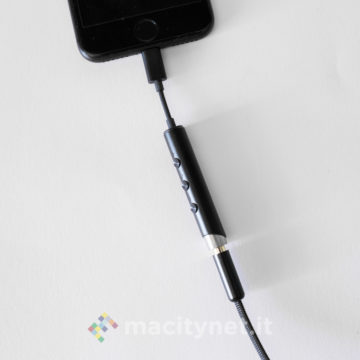 E’ piuttosto piccolo (10.5 x 1 centimetri) e leggero (11 grammi), la spina Lightning è piccola e il corpo principale è realizzato in robusto metallo, con tre pulsanti che permettono di gestire il player musicale senza dover interagire con il touchscreen del telefono.