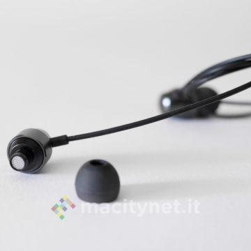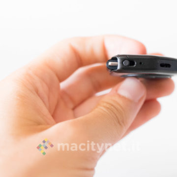 Il connettore Lightning è piuttosto piccolo, quindi si collega agevolmente agli iPhone protetti dalla maggior parte delle custodie attualmente in commercio. Sul telecomando, oltre al foro per il microfono, ci sono i tasti volume e il tasto multifunzione, più grande, che permette di interagire con Siri e gestire la riproduzione musicale.
