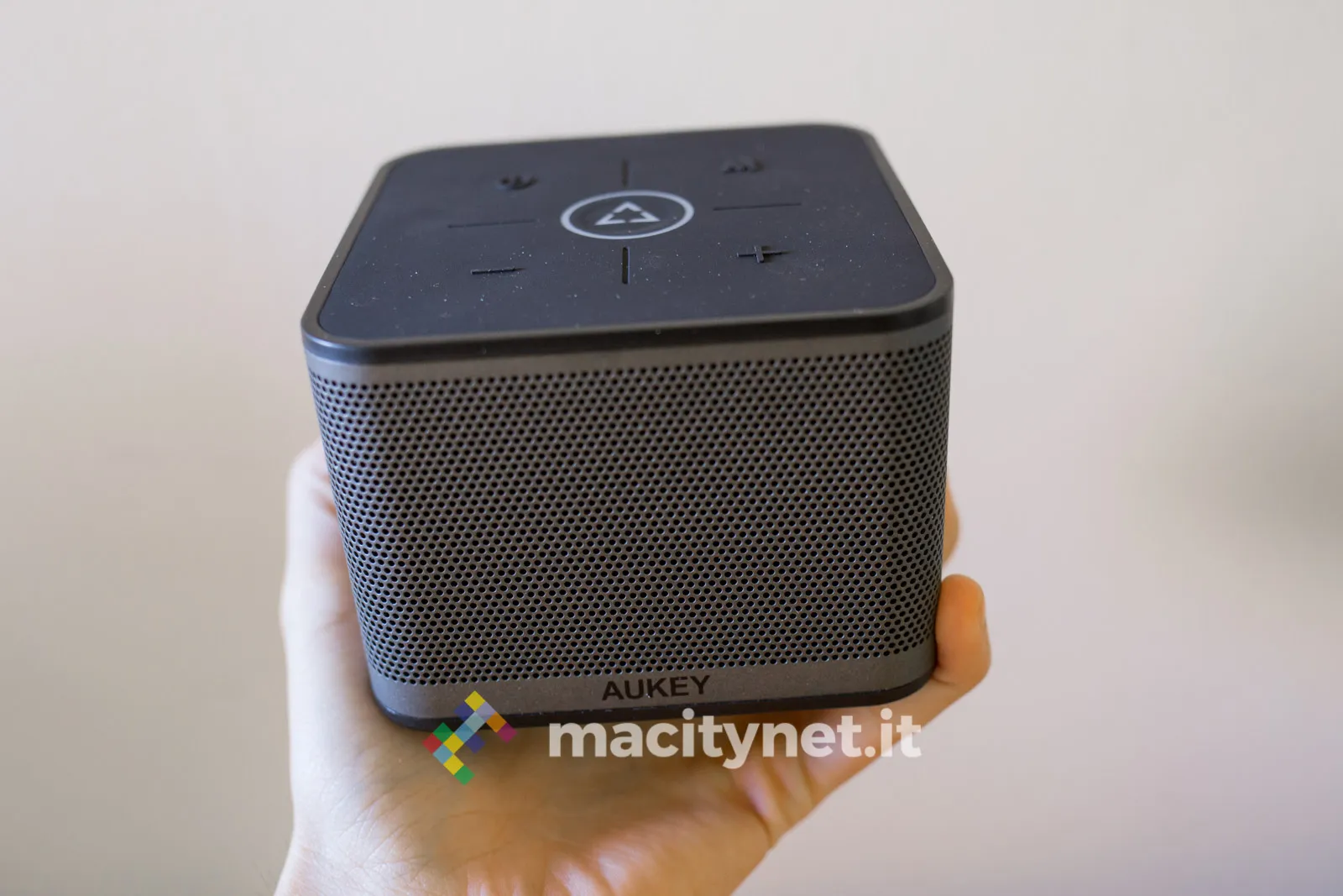 La cassa è di forma quasi cubica (misura 10.5 x 10.5 centimetri ed è alta 8 centimetri) con angoli stondati. La superficie superiore è piatta, in plastica rigida con rivestimento in gomma: lo stesso lo troviamo anche alla base, in prossimità dei quattro sporgenti piedini che assicurano un’ottima aderenza della cassa anche su superfici particolarmente lisce. Il rivestimento principale della cassa è una banda di metallo traforata che protegge i driver.