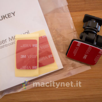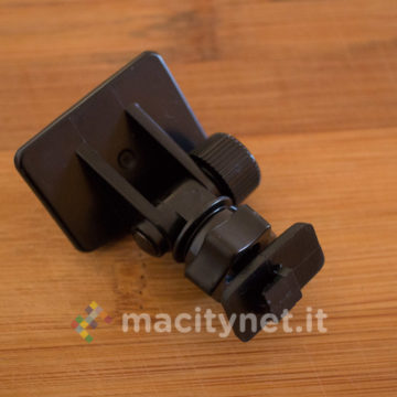 L’aggancio sul parabrezza è garantito dal piccolo supporto a ventosa (con leva a pressione) incluso nella confezione ed al quale si fissa attraverso – purtroppo – un sistema di aggancio proprietario, il che quindi inibisce l’eventuale uso di altri supporti di terze parti: in alternativa è possibile fissarla direttamente sul retro dello specchietto retrovisore – o dove più lo si ritiene opportuno – attraverso un ulteriore supporto con piastra adesiva 3M.