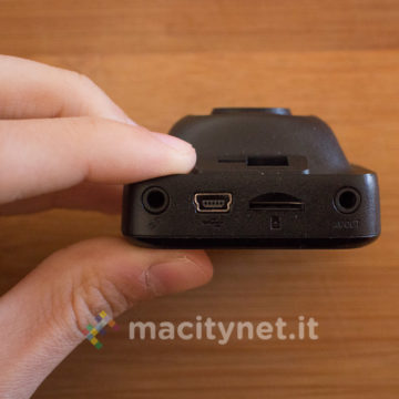 Il corpo della dashcam è realizzato interamente in plastica di ottima qualità, satinata sulla facciata frontale e liscia nella cornice posteriore. Su un bordo di quest’ultima sono incassati quattro pulsanti di controllo, di lato c’è un indicatore LED ed il foro che protegge il pulsante di Reset mentre sul lato superiore ci sono, nell’ordine, l’ingresso jack per il GPS (opzionale), la presa miniUSB per l’alimentazione 1A (ottima scelta, quella di abbandonare una presa proprietaria, anche se i cavi miniUSB sono più difficili da reperire in casa rispetto al più comune microUSB), lo slot microSD e la presa jack per l’uscita AV nel caso la si volesse collegare ad un monitor esterno.
