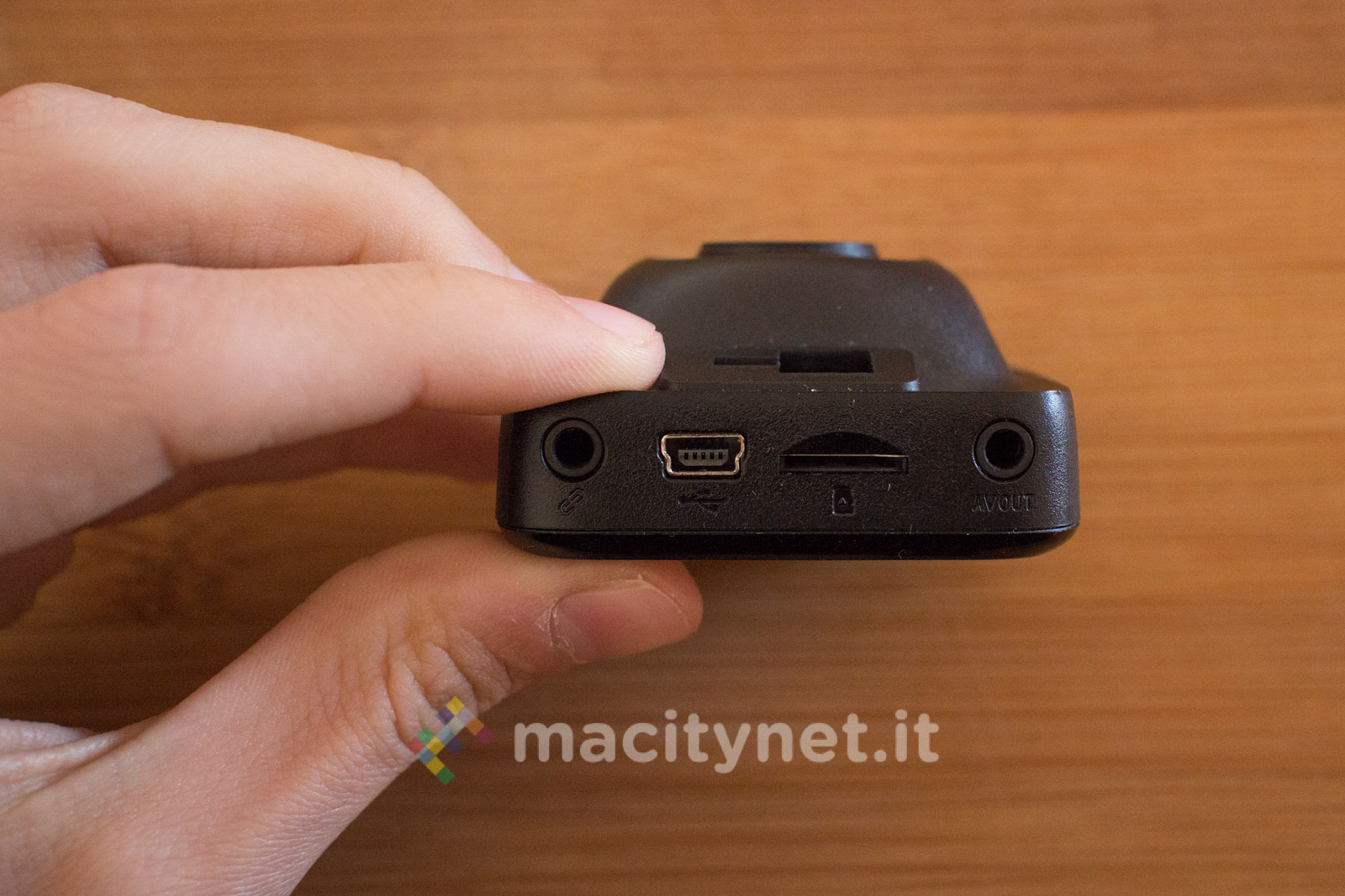 Il corpo della dashcam è realizzato interamente in plastica di ottima qualità, satinata sulla facciata frontale e liscia nella cornice posteriore. Su un bordo di quest’ultima sono incassati quattro pulsanti di controllo, di lato c’è un indicatore LED ed il foro che protegge il pulsante di Reset mentre sul lato superiore ci sono, nell’ordine, l’ingresso jack per il GPS (opzionale), la presa miniUSB per l’alimentazione 1A (ottima scelta, quella di abbandonare una presa proprietaria, anche se i cavi miniUSB sono più difficili da reperire in casa rispetto al più comune microUSB), lo slot microSD e la presa jack per l’uscita AV nel caso la si volesse collegare ad un monitor esterno.