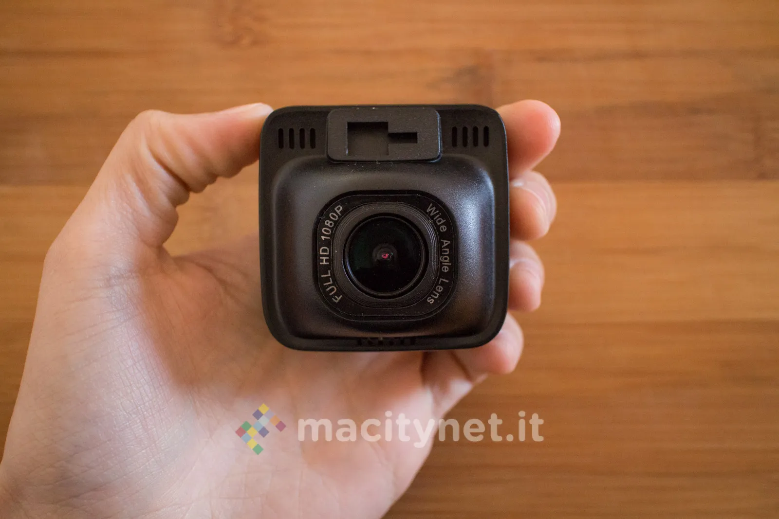 Nonostante, dicevamo, la presenza di un display LCD da 2 pollici, la dashcam mantiene comunque le dimensioni piuttosto contenute (misura circa 6 x 6 x 3 centimetri), riuscendo così a risultare discreta e poco invasiva durante la guida, specialmente se la si lascia “sparire” dietro lo specchietto retrovisore.