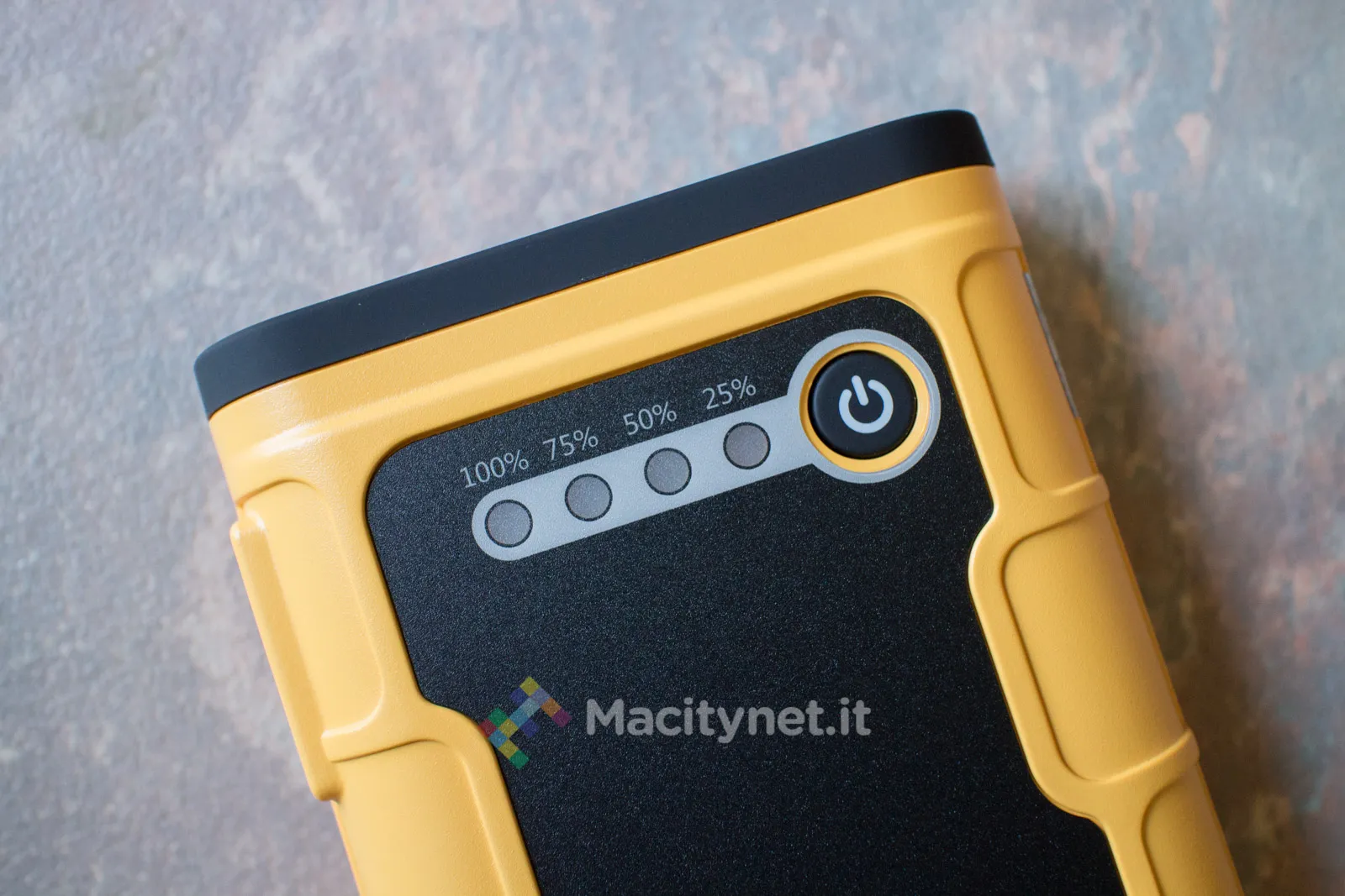 Da un lato troviamo un’uscita 12V/10A di cui però non viene fornito alcun cavo per poterla sfruttare: restano di fatto più funzionali le prese alloggiate nella base piatta, dove sono incassate due uscite USB rispettivamente da 1A e 2A, l’ingresso 15V/1A, la presa per i morsetti ed una torcia. Sulla facciata frontale sono invece posizionati i 4 LED che rappresentano la percentuale (0–25% ciascuno) di energia contenuta nella batteria ed il pulsante ON/OFF per verificare lo stato dei LED ed accendere la torcia (lunga pressione), cambiando eventualmente con un click le tre modalità di lampeggio (continua, strobo e SOS).