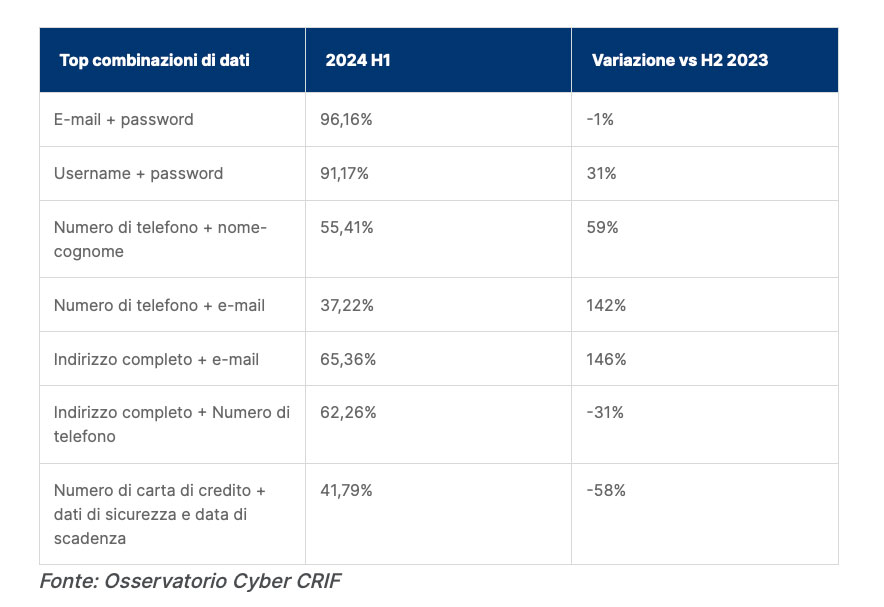 Particolarmente rilevante è la combinazione di numero di carta di credito, rilevata nel 41,79% dei casi, con i dati di sicurezza e la data di scadenza. Sebbene questa risulti in calo nei primi sei mesi dell’anno, rimane comunque un elemento preoccupante perché collegata al rischio di frodi finanziarie.