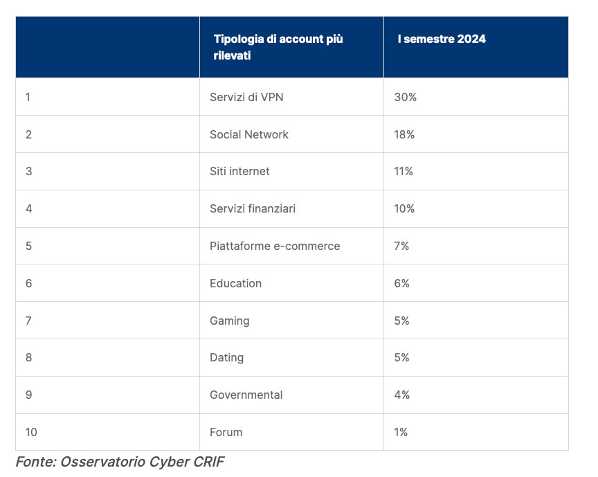 Tra le tipologie di servizi a cui corrispondono le username ritrovate sul dark web, con l’esclusione dei servizi di posta elettronica, nel I semestre 2024 risultano essere al primo posto (30%), i servizi di VPN (Virtual Private Network), sistemi sempre più utilizzati globalmente anche da account privati che permettono di creare una connessione sicura e privata a Internet, anche quando si naviga su una rete pubblica o poco sicura, come il Wi-Fi di un bar, di un treno o di un aeroporto.