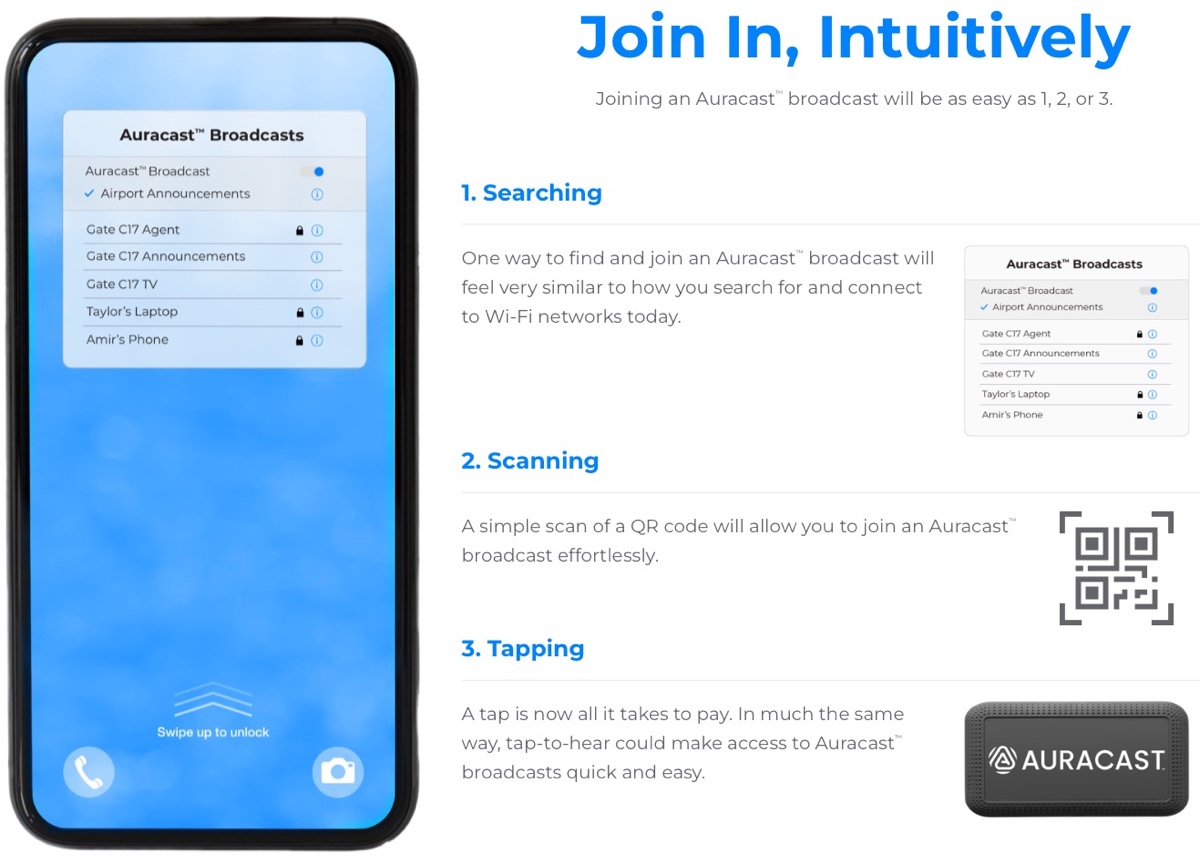 Ma mentre il Bluetooth è pensato per il collegamento uno a uno, Auracast funziona grossomodo come il Wi-Fi: i dispositivi che supportano questa funzione ricevono una lista dei canali audio Auracast disponibili tra cui l’utente può scegliere a quale collegarsi.