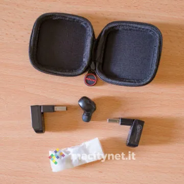 Nella confezione c’è una pratica custodia in simil-pelle con cerniera per agevolarne il trasporto, oltre ai gommini intercambiabili di varie misure per poterlo utilizzare al meglio con orecchie grandi o più piccole e due caricatori USB. Non ci sono cavetti per ricaricare la batteria interna: quest’ultima avviene infatti semplicemente appoggiando l’auricolare al suo caricatore, il cui aggancio avviene magneticamente. A quel punto è sufficiente infilarlo all’interno di una presa USB (che sia un caricatore, una porta del computer o una power bank) per avviare la ricarica dell’auricolare.