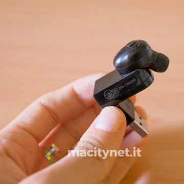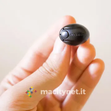 Come dicevamo è molto piccolo: pesa pochi grammi (la nostra bilancia da cucina non lo “vede” neppure) e la cassa è in plastica dura. Ha un solo pulsante, utile per l’accensione, lo spegnimento e la gestione delle telefonate. Vicino ad esso un piccolo LED blu funge da indicatore per l’accoppiamento iniziale con lo smartphone. La forma inoltre è piuttosto ergonomica: indossandolo, calza perfettamente nell’orecchio e sporge di pochissimo.