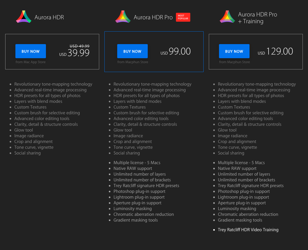 La versione di Aurora HDR disponibile su Mac App Store è la versione base ed include la tecnologia di mappatura del tono in tempo reale, preset di elaborazione delle immagini HDR per ogni tipo di foto, livelli con metodi di fusione personalizzate delle texture, un pennello personalizzato per l’editing selettivo, avanzati strumenti di editing della chiarezza, uno strumento per il dettaglio, strumenti come Glow, il ritaglio, radianza d’immagine curve tonali, vignettatura e condivisione.