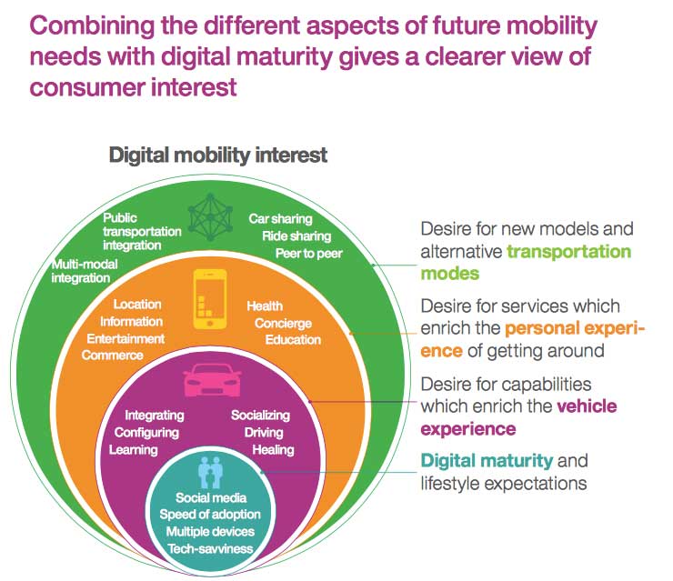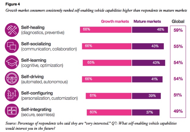 I consumatori hanno indicato di essere molto interessati a tutti gli aspetti di questo tipo di veicoli, ma le funzioni di diagnostica e le capacità di prevenzione di possibili problematiche hanno riscosso il più alto grado di interesse (59%) e in dieci su sedici paesi sono state considerate prioritarie. Grazie alla sempre più massiccia presenza di sensori e dell’avvento del cognitive computing, i produttori saranno in grado di comprendere meglio i problemi del veicolo, sviluppare tecnologie e raccomandare soluzioni senza che il conducente debba portare l’auto in manutenzione.