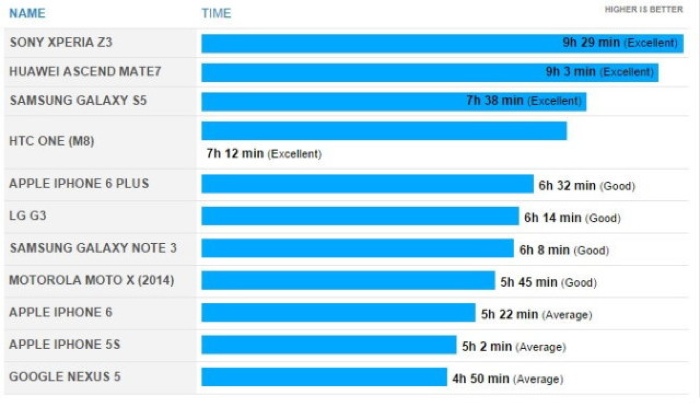 Le cose vanno un po’ meglio per iPhone 6 Plus che registra una autonomia di 6 ore e 32 minuti, ottenendo così la quinta posizione. Il test è stato effettuato impiegando uno script web realizzato su misura che simula il consumo energetico di una tipica giornata di impiego da parte dell’utente. Il podio di questa classifica è composto da un trio di terminali Android: al primo posto vince su tutti Sony Eperia Z3 presentato all’IFA di Berlino con ben 9 ore e 29 minuti di autonomia, seguito al secondo posto da Huawei Ascend Mate 7 con 9 ore e tre minuti, anche questo lanciato a IFA, infine al terzo posto da Samsung Galaxy S5 con 7 ore e 38 minuti.