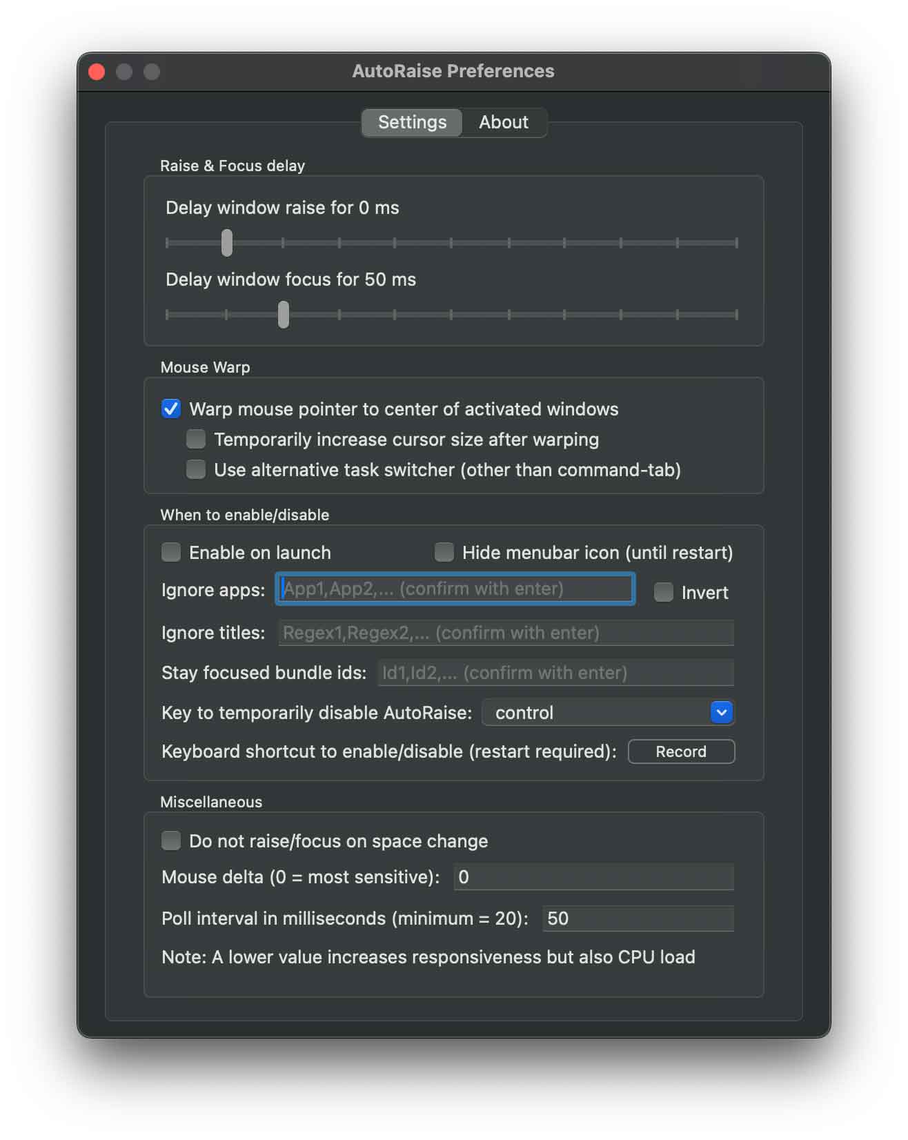 Facendo click con il tasto destro del mouse sull’icona di AutoRaise nella barra dei menu è possibile selezionare la voce “Preferences” e da qui modificare varie impostazioni: il ritardo (in millisecondi) prima di rendere attiva una finestra, se collocare il cursore al centro dello schermo quando si usa l’app switcher (Command-Tabo Command-Shift-Tab).