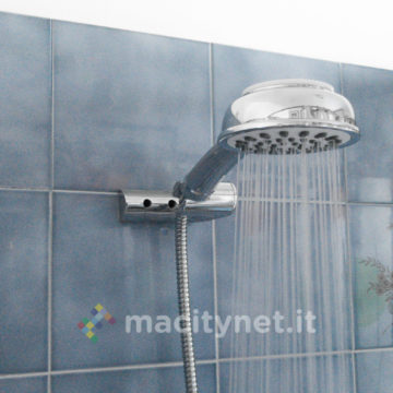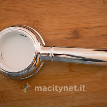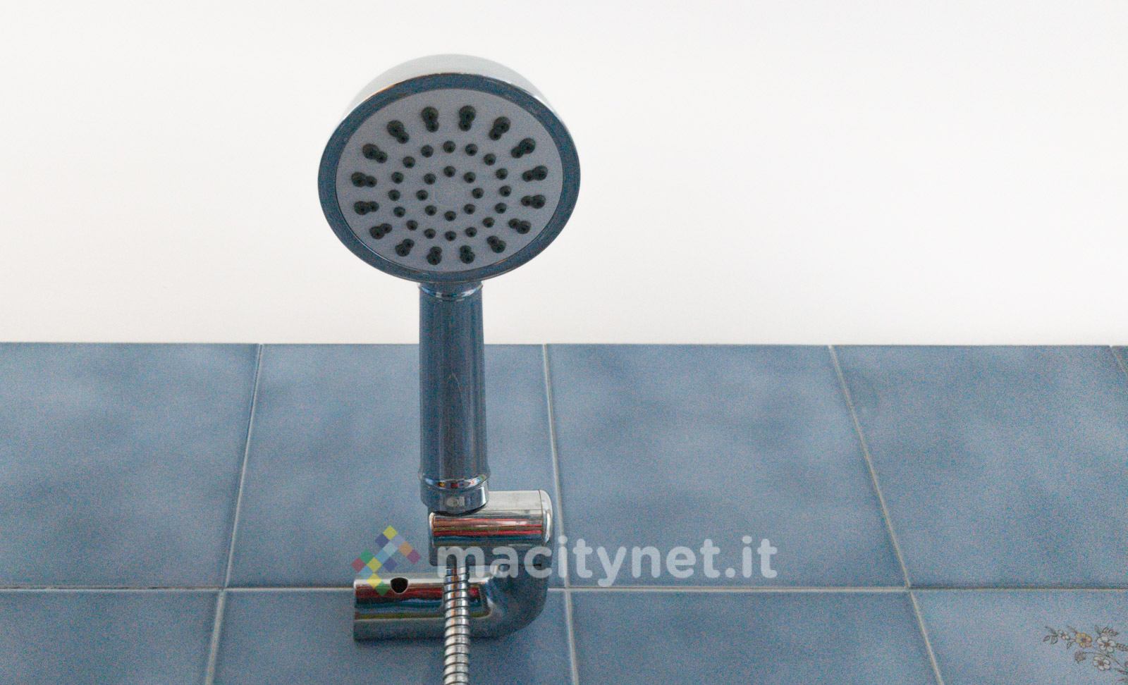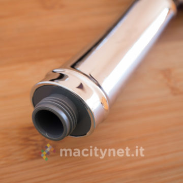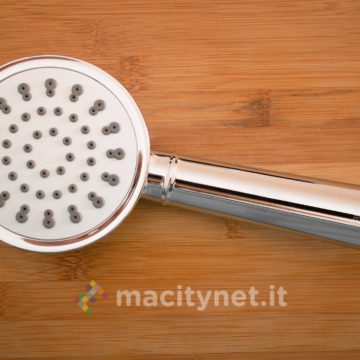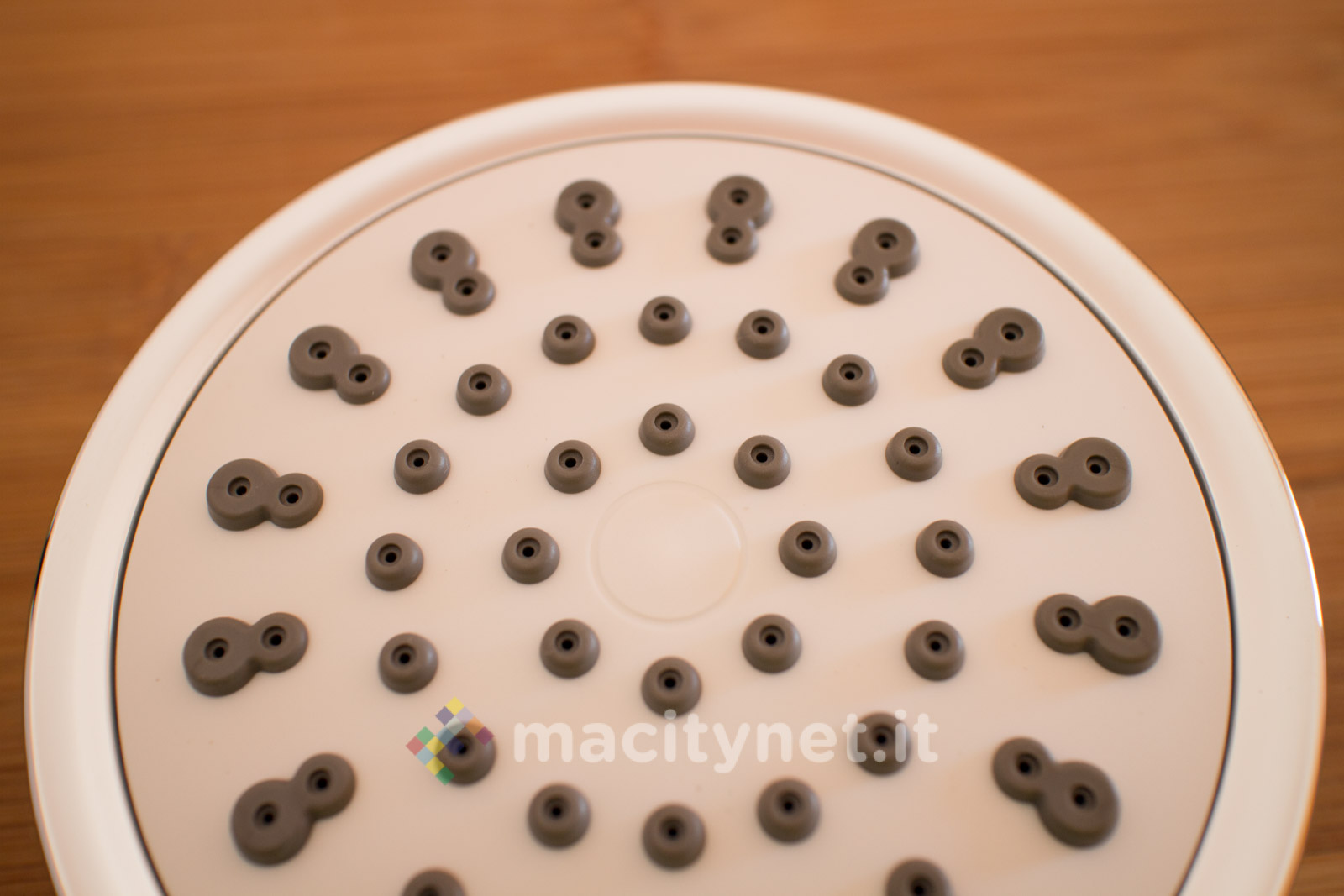 Preso in mano, il soffione non si discosta molto dai più classici, sia nella forma che nei materiali (ABS). È completamente cromato, con l’attacco a vite universale – in plastica – per il tubo della doccia. Gli ugelli sono in silicone, scelta adottata dalla gran parte dei soffioni per doccia in quanto aiuta a prevenire l’intasamento dei forellini da parte del calcare.