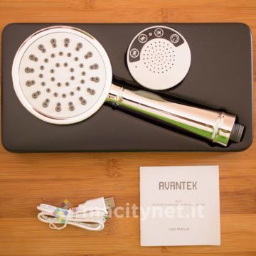 Avantek HB–01 si compone sostanzialmente di *due parti*: il soffione per la doccia (154 grammi, lungo 27 centimetri, diametro 10.3 centimetri) e l’altoparlante Bluetooth (79 grammi, spessore 3 centimetri, diametro 6.5 centimetri). Nella confezione arrivano già separati, dando così la giusta idea di ciò che si è appena acquistato nel momento in cui ci si avvicina per la prima volta ad un prodotto di questo tipo.