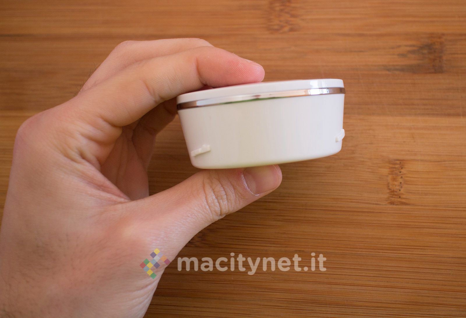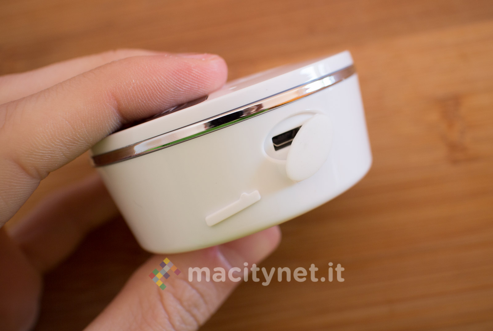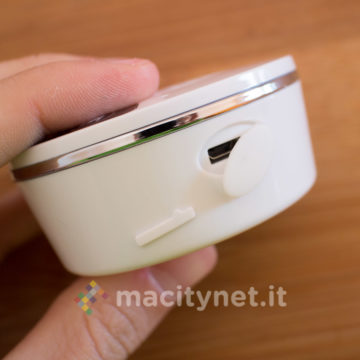 L’altoparlante è anch’esso interamente costruito in plastica satinata di colore bianco: su un lato troviamo la presa microUSB per la ricarica della batteria interna ben protetta da un tappo in silicone, sulla facciata frontale oltre ai fori per lo speaker c’è un indicatore LED e quattro tasti di funzionamento (ON/OFF, Play/Pausa, Avanti e Indietro), oltre al forellino per il microfono.