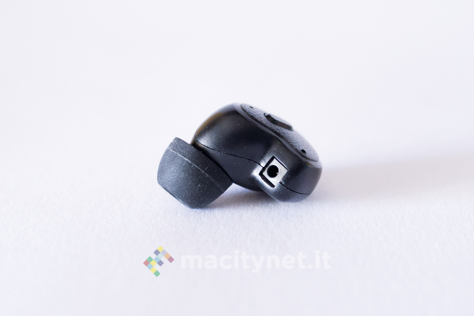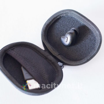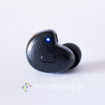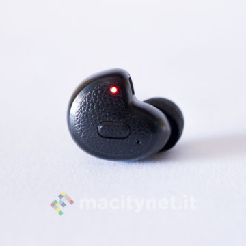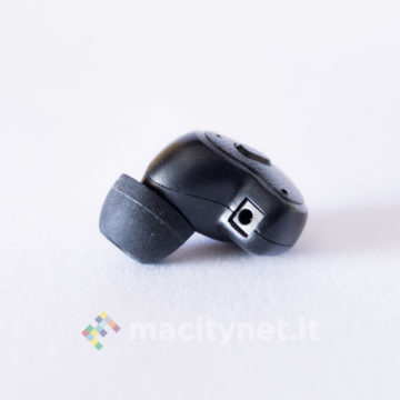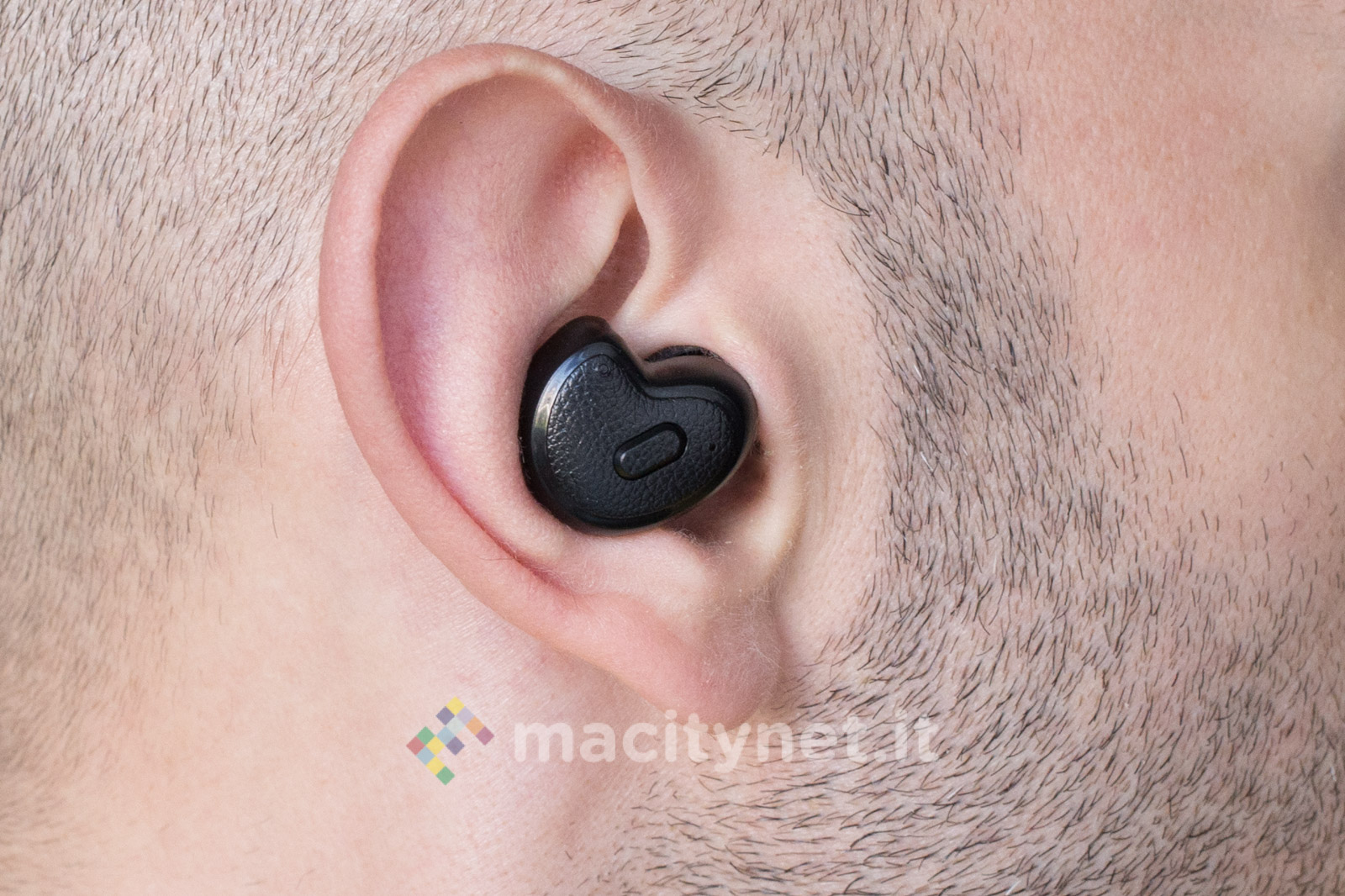 Appena lo abbiamo infilato nell’orecchio siamo rimasti stupiti dalla stabilità dell’auricolare. Come dicevamo è la forma che ben si adatta all’interno della cavità auricolare, occupando tutto lo spazio e bloccandosi saldamente al suo interno. Rispetto ad altri auricolari non ha bisogno di archetti o altri accessori e, contrariamente a quanto possa sembrare, non ci è mai caduto dall’orecchio, neanche durante una giornata molto afosa al parco (dove avevamo il viso completamente sudato) o durante una corsa nell’area pedonale della nostra città, dove abbiamo volutamente scosso bruscamente il capo per testarne l’efficacia del sistema.