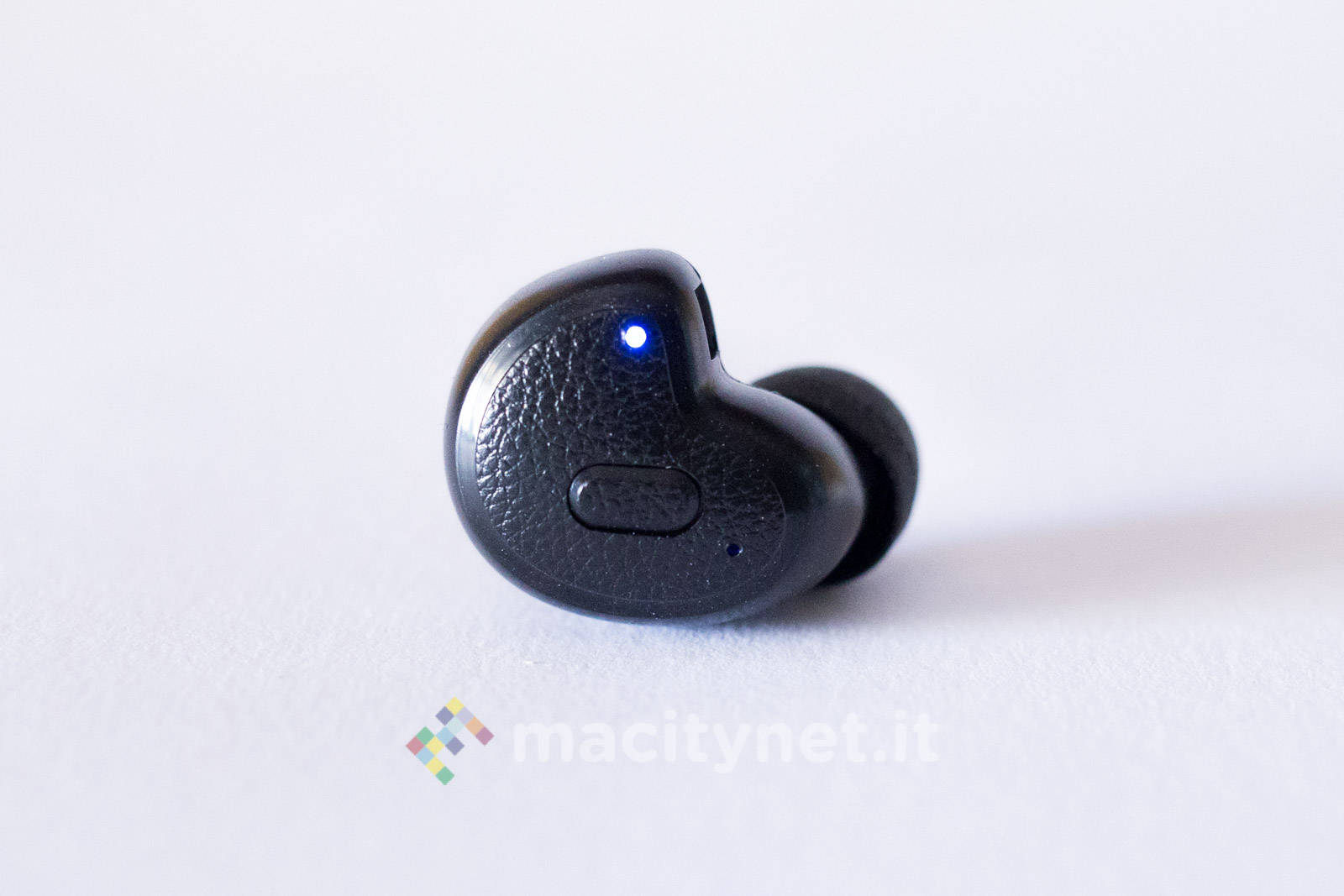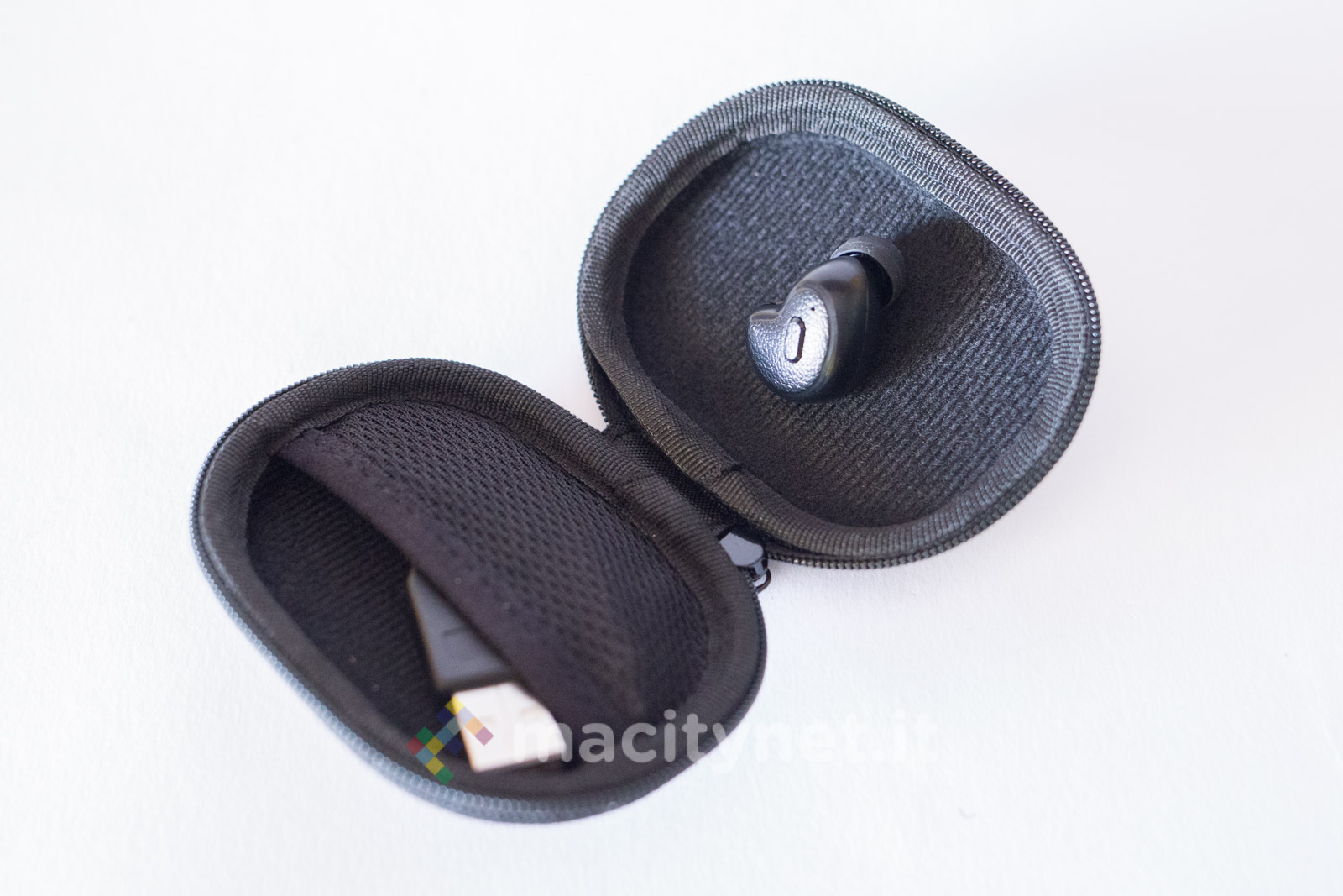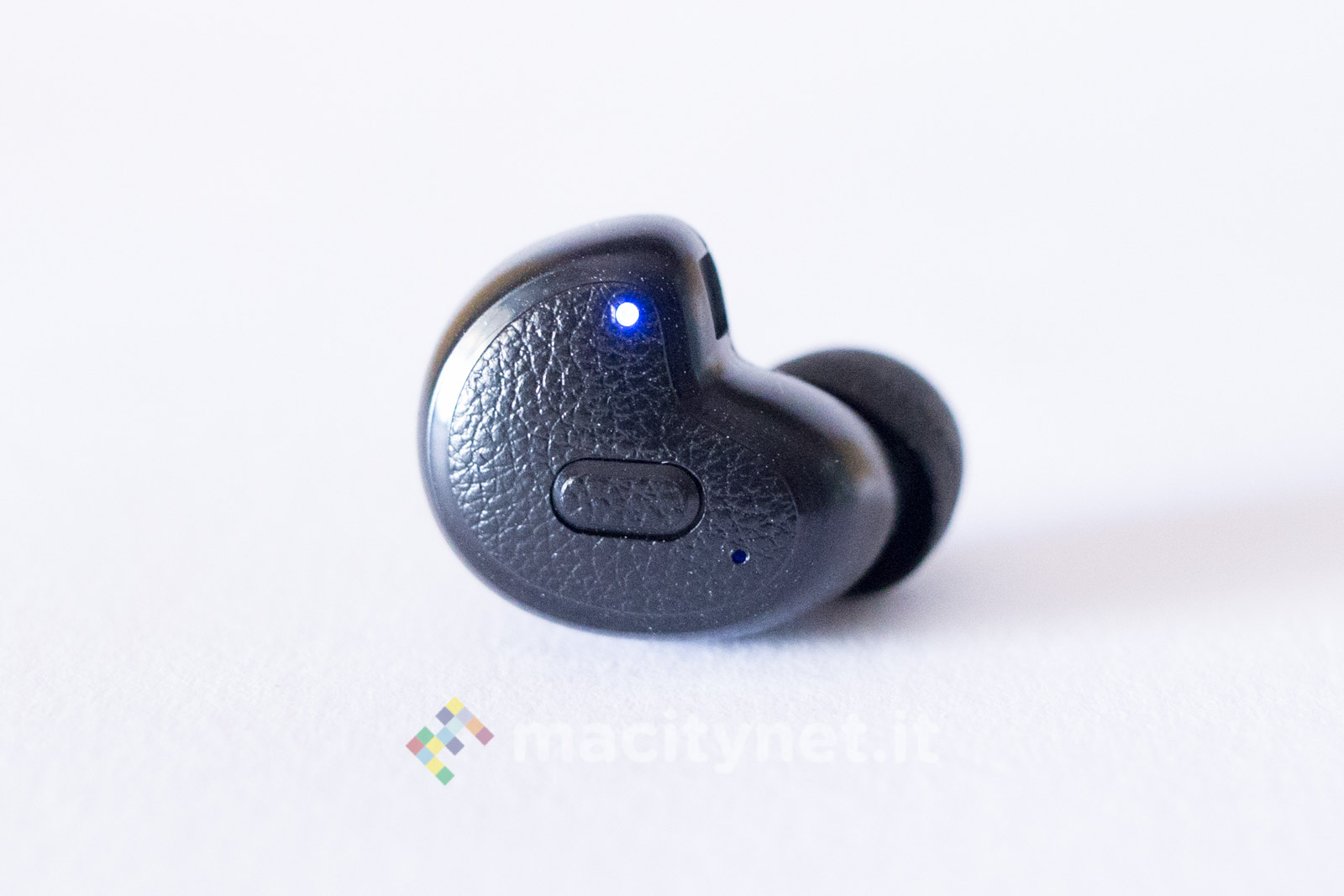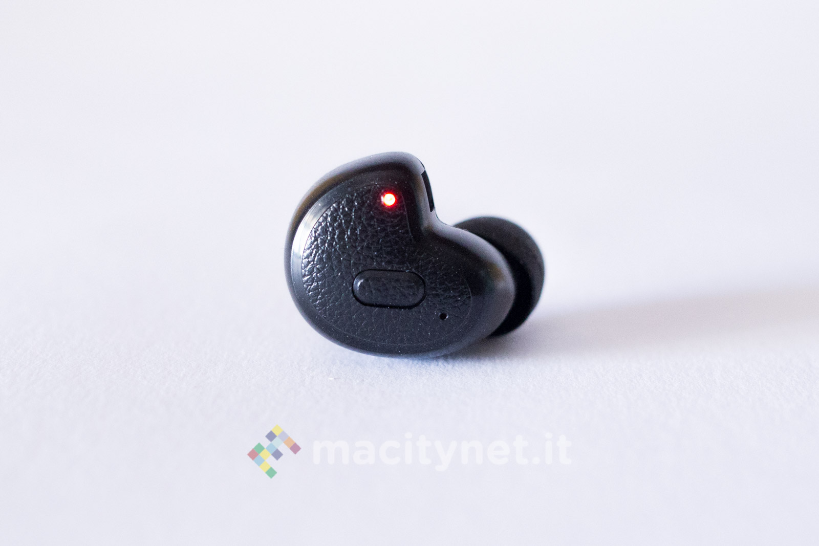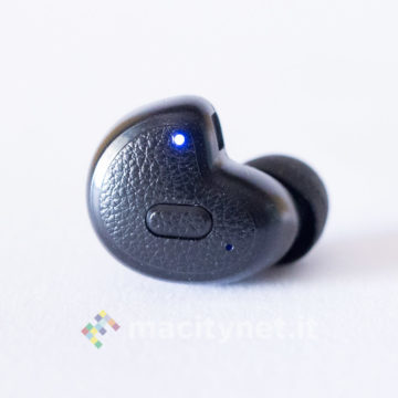 Per riuscire in questa miniaturizzazione di pesi e misure l’azienda ha scelto un corpo in plastica rigida molto leggera, liscia nella parte interna a contatto con l’orecchio e ruvida in quella esterna, dove trova posto l’unico pulsante che regola l’accensione e permette di gestire le telefonate. L’unica parte in metallo è la rete che protegge il driver mentre l’auricolare che si blocca nell’orecchio è rivestito dal classico gommino in-ear, di cui troviamo due diverse misure incluse in confezione.