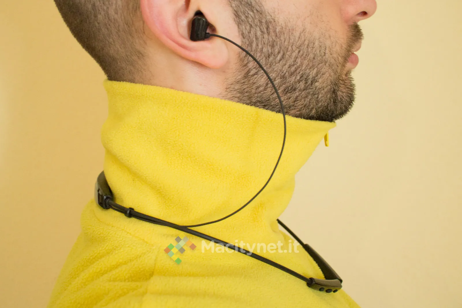 Le due clip anteriori che si chiudono con un magnete montano, da un lato, il pulsante On/Off, il microfono e l’indicatore LED, dall’altro, i pulsanti per il controllo del volume e della gestione di telefonate e riproduzione musicale. Gli auricolari sono invece collegati all’archetto attraverso il cavo, lungo all’incirca 25 centimetri per ciascun auricolare, e tenuti in posizione da una piccola slitta che può scorrere lungo l’archetto, potendo così essere regolati nella giusta lunghezza quando si ascolta la musica evitando cavi penzolanti.