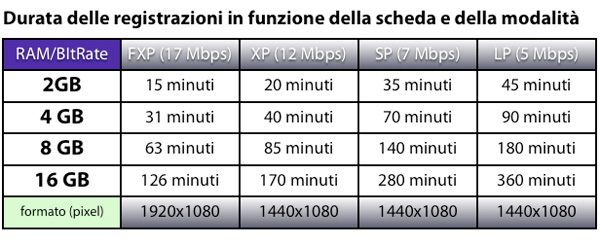 Ci viene in aiuto questa tabella estratta dal manuale di istruzioni della Canon HF100 e che abbiamo estrapolato per le dimensioni della Ram flash fino a 16 GB.