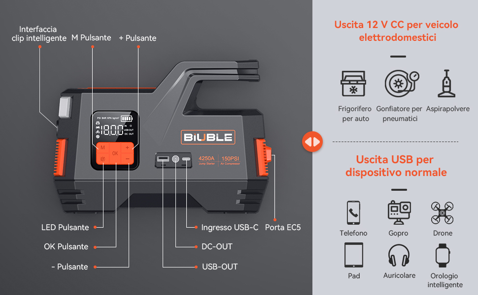 In primo luogo serve come booster. In termini pratici grazie alla batteria interna capace di fornire una corrente di picco di 4250A è in grado di supportare all’avvio un mezzo coa batteria interna in condizioni precarie.