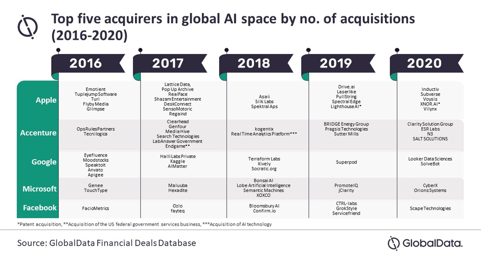 Apple è il principale acquirente di aziende nell’ambito dell’intelligenza artificiale. È quanto emerge da una ricerca di GlobalData: dal 2016 al 2020, Apple ha acquisito il maggior numero di aziende legate all’IA, battendo Accenture, Google, Microsoft e Facebook, ognuna delle quali ha portato a termine acquisizioni nell’ambito IA.