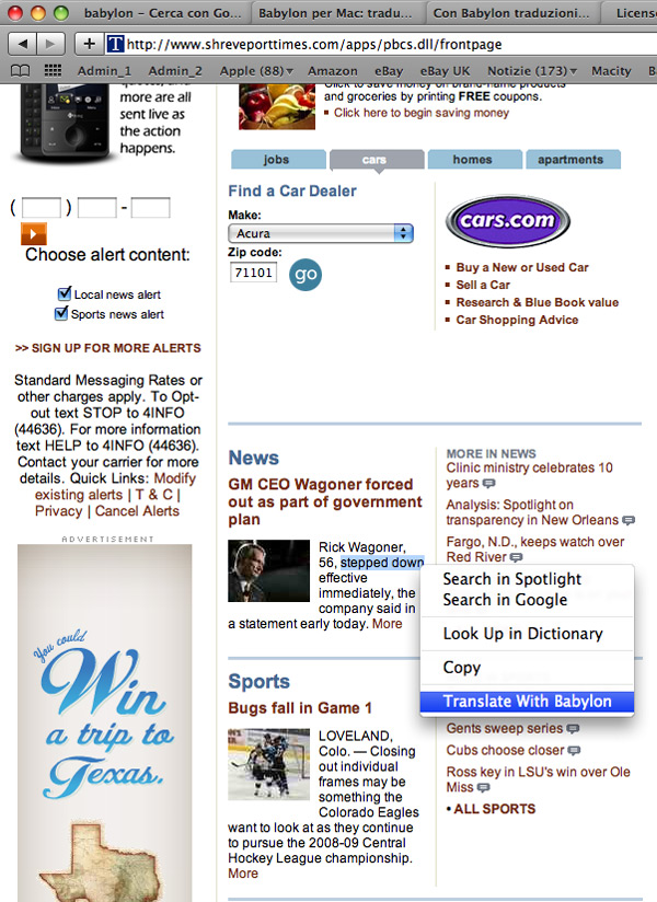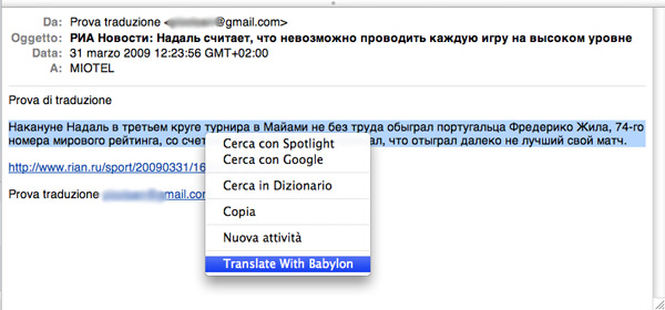 Dopo aver riavviato il Mac possiamo iniziare immediatamente a utilizzare Babylon, senza nemmeno dover lanciare l’esecuzione del programma. All’interno di una mail, di una pagina Web di Safari o Firefox evidenziamo una parola o una frase che desideriamo tradurre e facciamo un clic destro del mouse. Nel menu contestuale del Mac Babylon ha aggiunto la nuova voce “Translate with Babylon”: basta sceglierla per ottenere rapidamente la traduzione della o delle parole selezionate. La traduzione all’interno dei programmi funziona anche in Word, Pages, nei documenti PDF in TextEdit e nella maggior parte degli applicativi che visualizzano documenti HTML e di testo.