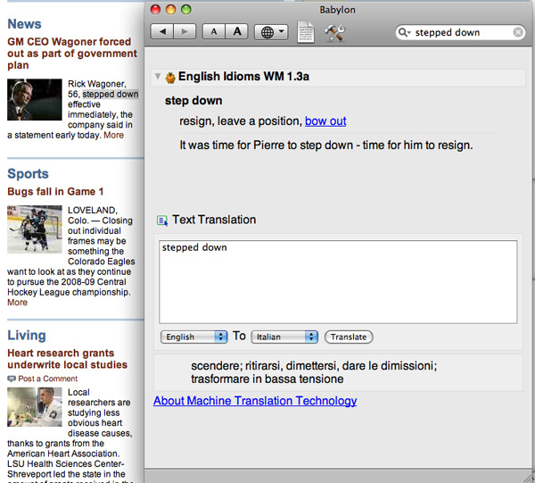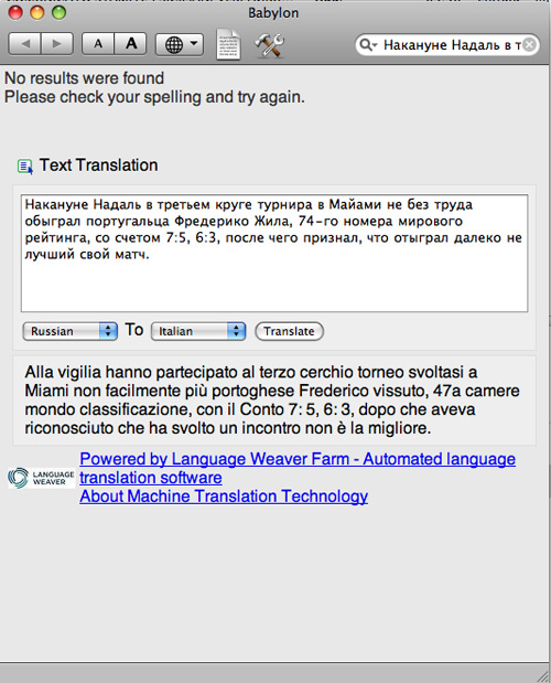 Ricordiamo che la prima versione disponibile per Mac effettua traduzioni esclusivamente accedendo ai dizionari Babylon su Internet, così il porgramma non può essere utilizzato in assenza di connessione Web. Ciò nonostante il software risulta molto più pratico e veloce rispetto ai servizi di traduzione gratuiti disponibili sul Web, soprattutto perché effettua la traduzione direttamente all’interno del documento e del programma che stiamo utilizzando, senza dover uscire, aprire il browser, andare sulla pagina di traduzione infine eseguire il copia e incolla del testo. Qui di seguito riportiamo diversi esempi di funzionamento di Babylon per Mac impegnato a tradurre testo in diverse lingue.
