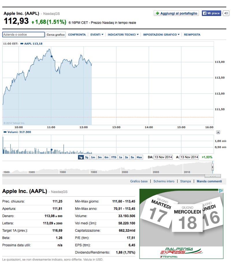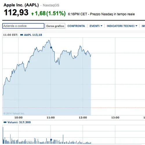 Mentre scriviamo questo articolo le quotazioni oscillano perché alcune delle principali borse USA sono ancora aperte. Pochi minuti fa il titolo Apple è arrivato a toccare +1,75% per un prezzo per azione scambiata di ben 115,20 dollari. Successivamente il rialzo è rientrato leggermente fino a +1,61% per una valutazione di 113,04 dollari per azione. Naturalmente è possibile che prima della chiusura la quotazione del titolo AAPL subisca un ulteriore calo, in ogni caso il record storico è già stato ampiamente superato.