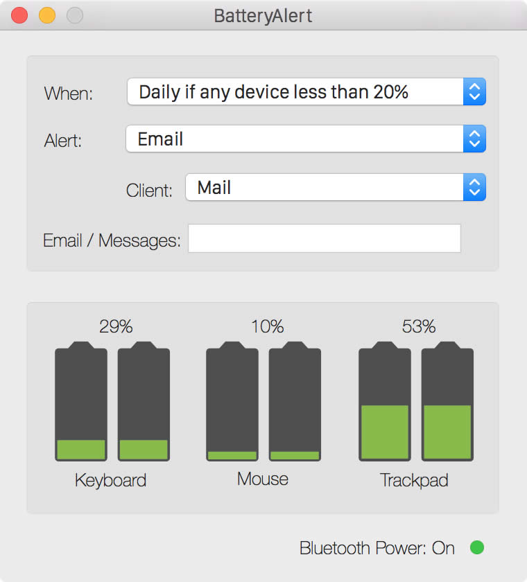 Sono ormai molti i dispositivi Bluetooth che è possibile collegare al Mac: tastiere, mouse, speaker, trackpad, tavolette grafiche e tanti altri ancora. Questi dispositivi wireless sono molto comodi e possono essere sfruttati liberando la scrivania dai fili. Bisogna ovviamente ricordarsi di cambiare le batterie su ciascuno di essi quando queste si esauriscono. A ricordarci di acquistare nuove pile o mettere a ricaricare quelle ricaricabili di tastiera, mouse e trackpad ci pensa BatteryAlert, una comoda utility gratuita che permette di mostrare avvisi quando, ad esempio, la carica è inferiore a una determinata percentuale. I messaggi possono essere visualizzati sullo schermo oppure, in alternativa, inviati via mail, notifiche o altri sistemi.