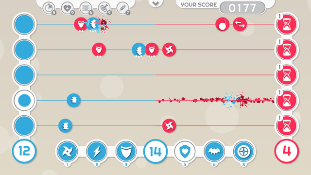 Il combattimento avviene per vie orizzontali in un campo di battaglia che potrebbe essere paragonato, grosso modo, ad uno spartito musicale. Su ogni riga il giocatore potrà lanciare i propri puntini, ciascuno con abilità particolari. Ad esempio, la clessidra blocca per qualche secondo gli attacchi avversari, lo scudo riesce a parare i pallini nemici per tre volte, il lampo corre più velocemente nel campo di battaglia, e così via: i pallini e le tipologie di abilità disponibili nel corso dell’avventura sono davvero tanti, oltre 15. Lo scopo è quello di raggiungere l’estremità opposta di questo spartito, colpendola con quanti più pallini possibile. Ovviamente, anche la CPU lancerà all’interno dello spartito i propri pallini rossi, ciascuno dei quali contenenti una diversa abilità. Il giocatore, allora, dovrà schierare le proprie truppe anche sulla base delle mosse avverse, cercando di prendere in contropiede il nemico.