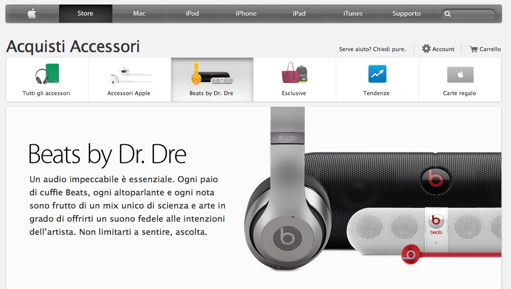 Dalla serata di giovedì disponibile Beats su Apple Store online con una sua sezione dedicata tra quelle degli accessori. «Un audio impeccabile è essenziale. Ogni paio di cuffie Beats, ogni altoparlante e ogni nota sono frutto di un mix unico di scienza e arte in grado di offrirti un suono fedele alle intenzioni dell’artista. Non limitarti a sentire, ascolta», è la frase di benvenuto che i naviganti e i clienti troveranno sulla pagina dedicata alle cuffie e agli accessori musicali col marchio di Dr. Dre.