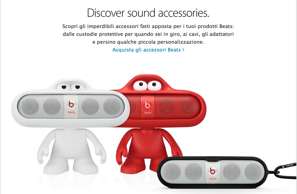 L’apertura della nuova sezione Beats su Apple Store online arriva pochi giorni dopo l’ufficializzazione del completamente dell’acquisizione, che era già stata salutata proprio dalle pagine del sito di Apple con un Benvenuti in famiglia. D’ora in poi tutti i prodotti Beats si potranno acquistare direttamente dal negozio online di Apple. Quattro le sotto sezioni disponibili: una dedicata al “must have” di Beats, le cuffie di qualità e tra il pubblico giovanile molto cool, con prezzi da poco meno di 200 euro a poco più di 300 euro. Poi gli auricolari con prezzi che partono da poco meno di 100 euro fino a circa 150 euro, gli altoparlanti Bluetooth con modelli da 200 a 300 euro ed infine gli accessori: cavetti, accessori e soprattutto la statuina Pill Dude in quattro colori: nero, bianco, rosa e rosso, il simpatico personaggio dall’espressione stranita che al posto del sorriso ha una cassa Beats.