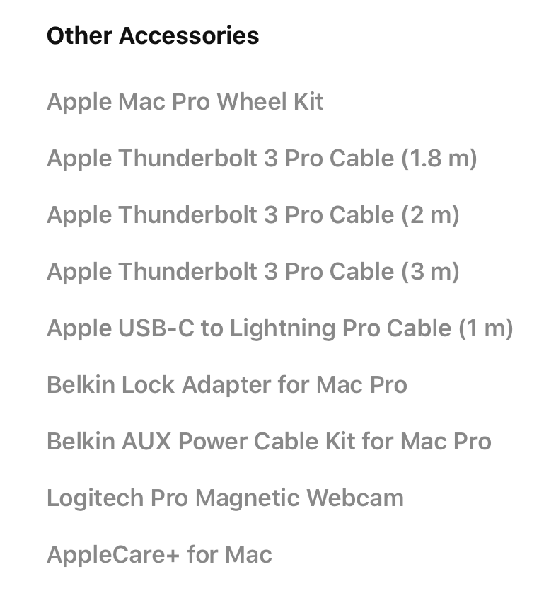 Sempre nella pagina con le specifiche tecniche del nuovo Mac Pro, sono elencati prodotti Thunderbolt per utenti “Pro”, inclusi cavi Thunderbolt 3 e cavi Lightning di varie lunghezze. Tra gli accessori di Apple presentati in anteprima insieme al nuovo computer, ci sono: il Pro Stand (per “pivottare” il monitor, alzarlo e abbassarlo) e l’adattatore VESA, che costeranno rispettivamente $999 e $199. Anche qui qualche produttore di terze parti potrebbe sbizzarrirsi e offrire accessori meno costosi