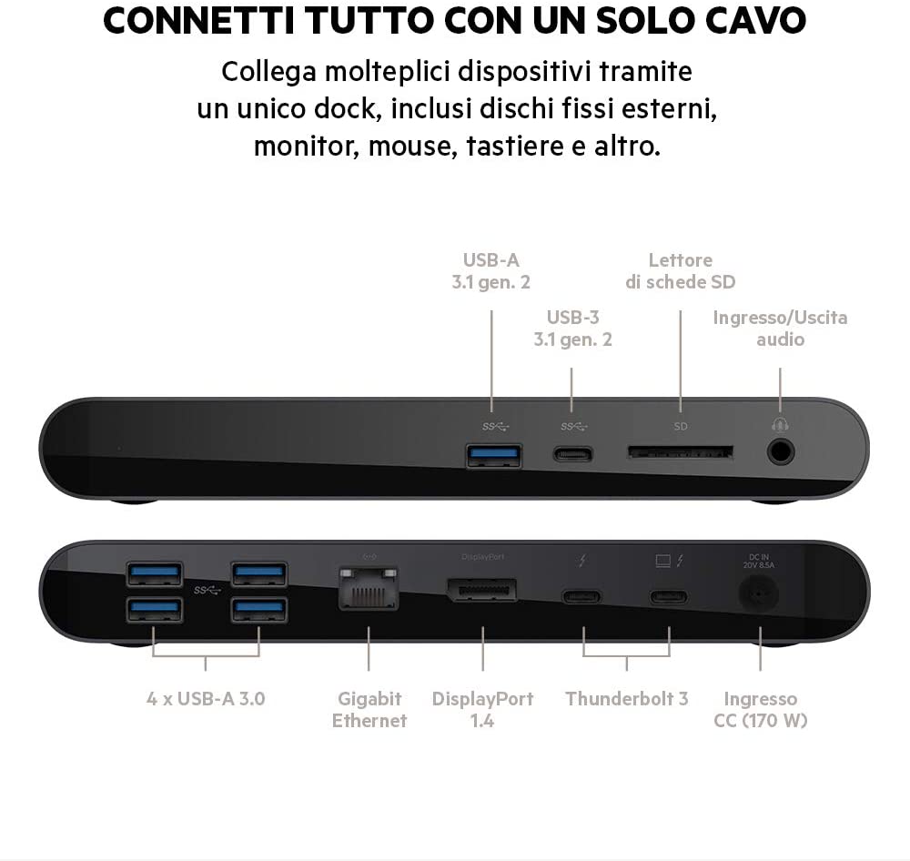 Il Dock Thunderbolt 3 Pro di Belkin è ora stato sostituito dal Thunderbolt 4 Pro di Belkin che però costa più di 300€ e per la maggior parte di chi legge offre vantaggio non troppo sfruttabili (come ad esempio supporto Monitor 8K) e un differente disposizione delle porte.