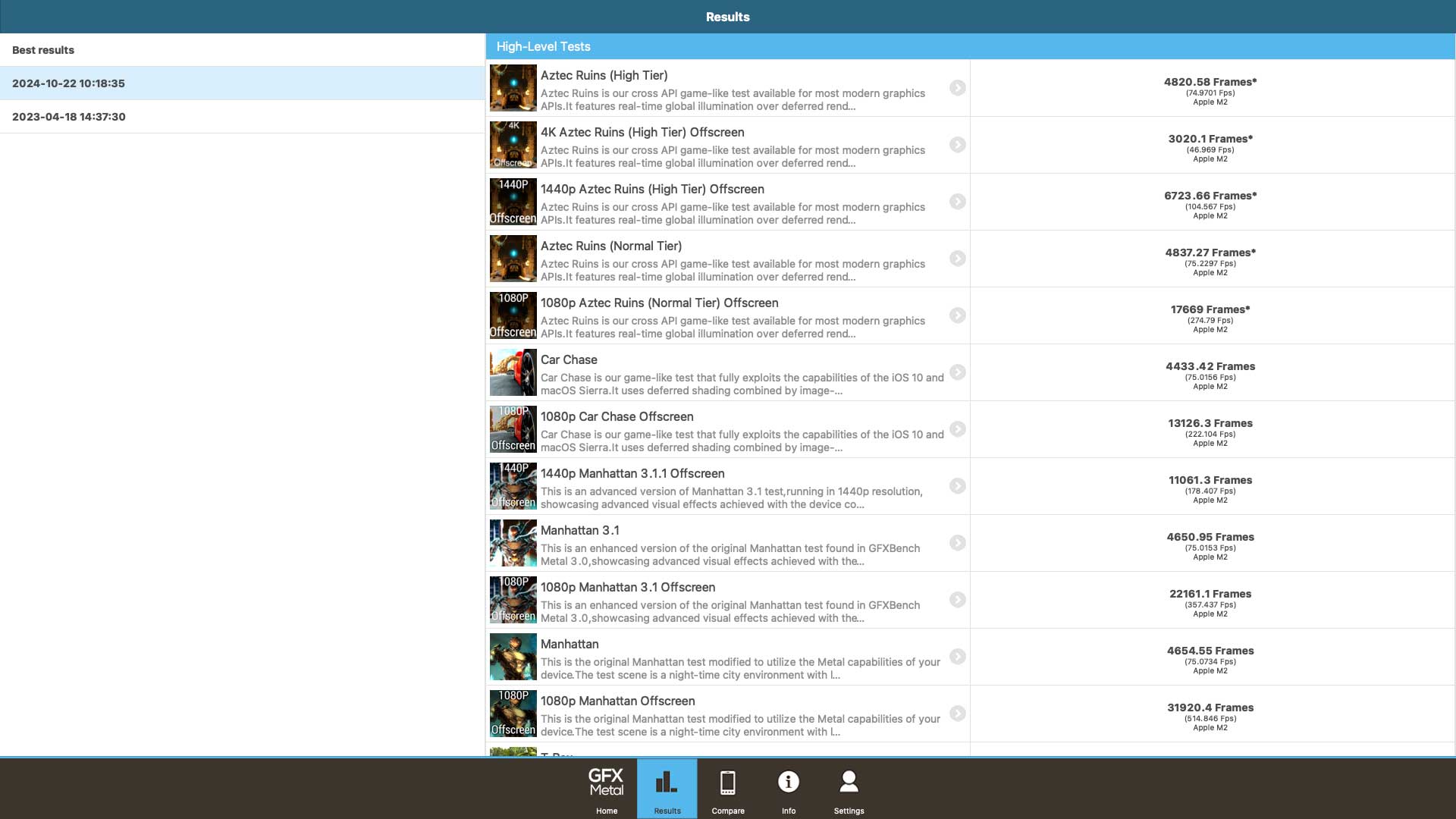 I risultati possono essere confrontati con altri da una pagina web dedicata. Una scena di test denominata Aztec Ruins permette di verificare la velocità in due varianti: con risoluzione 1080p e 1440p, caricando di lavoro la GPU per mettere alla prova le prestazioni grafiche, e fornire informazioni dettagliate sugli FPS e altri valori.