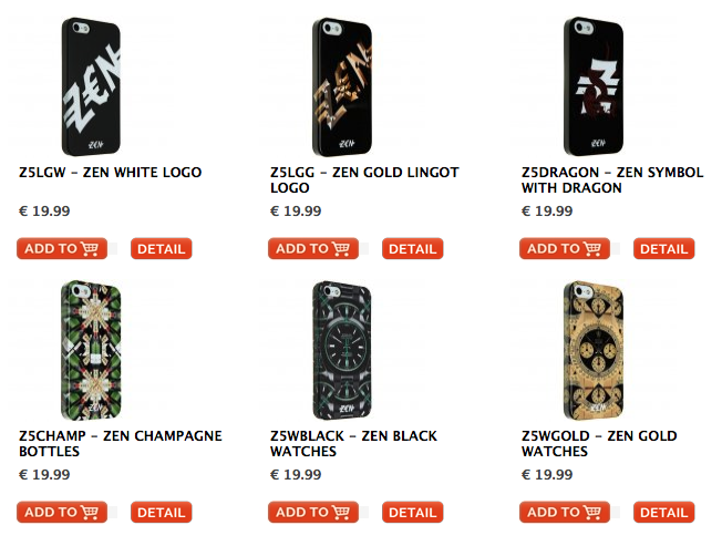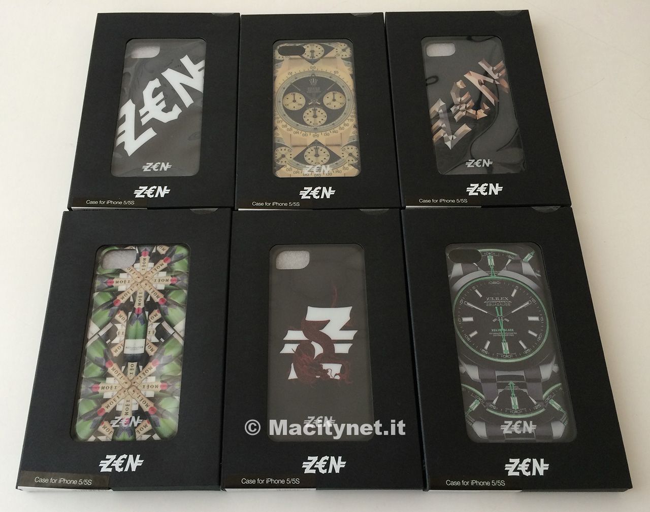 Realizzate in diversi modelli sia di duro policarbonato di alta qualità che un materiale più morbido con finitura in gomma, le custodie proteggono l’iPhone 5/5S e iPhone 6 e donano quel tocco di stile che contraddistingue le maglie sponsorizzate dall’artista, con il logo ZEN in più versioni su sfondo nero, con le bottiglie di champagne o con la più caratteristica trama di orologi in nero-verde oppure in oro le finiture sono lucide o mattate e vediamo i dettagli nella nostra galleria fotografica.