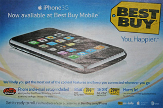 A partire dal 7 settembre gli americani potranno acquistare un iPhone 3G anche nei negozi Best Buy, la prima catena negli Stati Uniti per l’elettronica di consumo. Fino a oggi in USA era possibile comprare un iPhone direttamente in uno dei 190 Apple Store oppure presso uno dei punti vendita autorizzati dall’operatore AT&T, circa 2000 in tutti gli USA ma non presso rivenditori indipendenti.