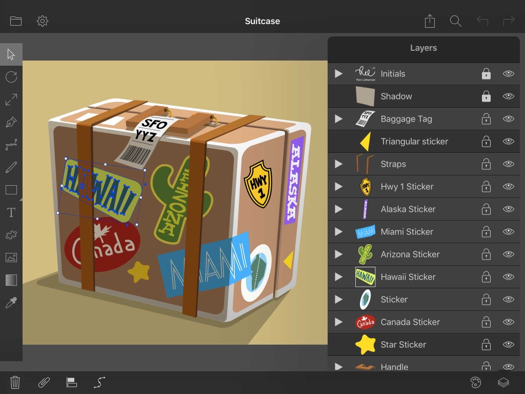 L’applicazione ricorda per molti versi Adobe Illustrator ma sfrutta ottimizzazioni specifiche possibili con il tablet di Apple. Gli strumenti di serie permettono di creare nuove forme modificando estremi, traccia, tratti; sono supportate stili multipli (pennellate, riempimenti, ombreggiature); è possibile ruotare, scalare e traslatare oggetti in modo interattivo o indicando valori numerici. Il numero di layer supportati è illimitato; stessa cosa per gli oggetti che è possibile raggruppare e il numero di “annulla”. Non mancano funzioni che consentono di allineare gli oggetti e griglie “smart” e altre per applicare operazioni booleane tra oggetti, fondendoli secondo varie modalità. Sono supportati ovviamente anche pan e zoom (fino al 4096%).