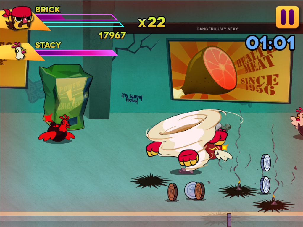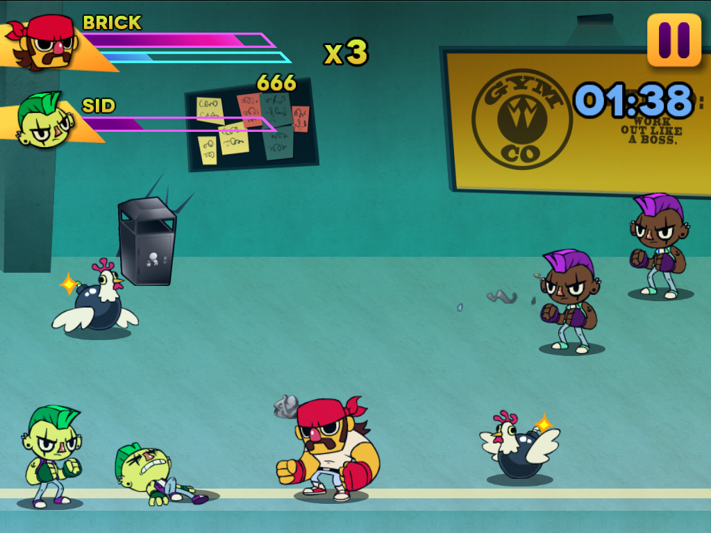 Big Action Mega Fight!, d’ora in avanti abbreviato in BAMF!, è un classico picchiaduro a scorrimento laterale, che omaggia la vecchia scuola, proponendo una struttura di gioco davvero tradizionale, ma un gameplay rinnovato per adattarsi perfettamente allo schermo tattile di iPhone e iPad. E’ sufficiente un solo tap a schermo per indirizzare il brutto ceffo protagonista di gioco all’interno dei vari livelli, mentre con slide verso destra o sinistra potremo iniziare una sequenza di pugni devastanti. Attraverso svariate gesture, invece, sarà possibile attivare combo e mosse speciali. Ad esempio, disegnando un piccolo cerchio sullo schermo sarà possibile acciuffare delle galline bomba, mentre con slide a due dita si attiverà un tornado in grado di spazzare via tutti i nemici. Lo scopo del gioco è quello di liberare le strade di Metropolis dai vari teppisti.