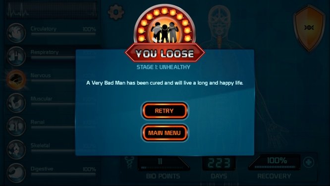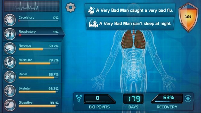 In realtà il contesto è piuttosto asettico, con gli stilemi grafici della scienza inodore e insapore alla Csi: nessuna immagine realistica, solo il modello del corpo umano e valori e statistiche da tenere sott’occhio. Unica cessione – ma comunque abbastanza inquietante – su questo punto gli effetti sonori con il respiro che si fa affannoso e il cuore che inizia a perdere colpi. Il Gameplay di Bio Inc è semplice, tanto che alla lunga potrebbe anche essere ripetitivo: il paziente all’inizio ha tutti i sistemi funzionanti. Il giocatore deve raccogliere i virus all’interno del corpo tappando su di loro e accumulando punti bio, da spendere per scatenare le più terribili malattie. Il poveretto però non stara a guardare: si rivolgerà a un medico contrastando le nostre azioni. Il tutto in 12 livelli con oltre un centinaio di condizioni mediche con le quali dovremo misurarci.