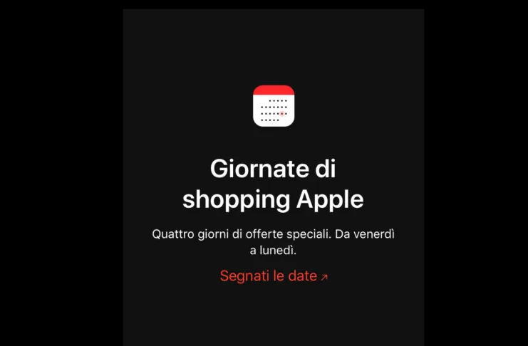 Nell’app Apple Store, si può notare, su sfondo nero, lo slogan “Giornate di shopping Apple”, l’indicazione relativa a “Quattro giorni di offerte speciali. Da venerdì a lunedì” e l’invito “Segnati le date”. Facendo tap sul link, si accede a un clip in cui – sempre su sfondo nero – si possono notare le date 23-24-25-26 novembre, con la didascalia “Arrivano le nostre quattro grandi giornate di shopping. Comincia a fare i tuoi regali di Natale questo venerdì”. A questo punto sarà possibile mettere le date in calendario, con un tap sulla freccia rossa.