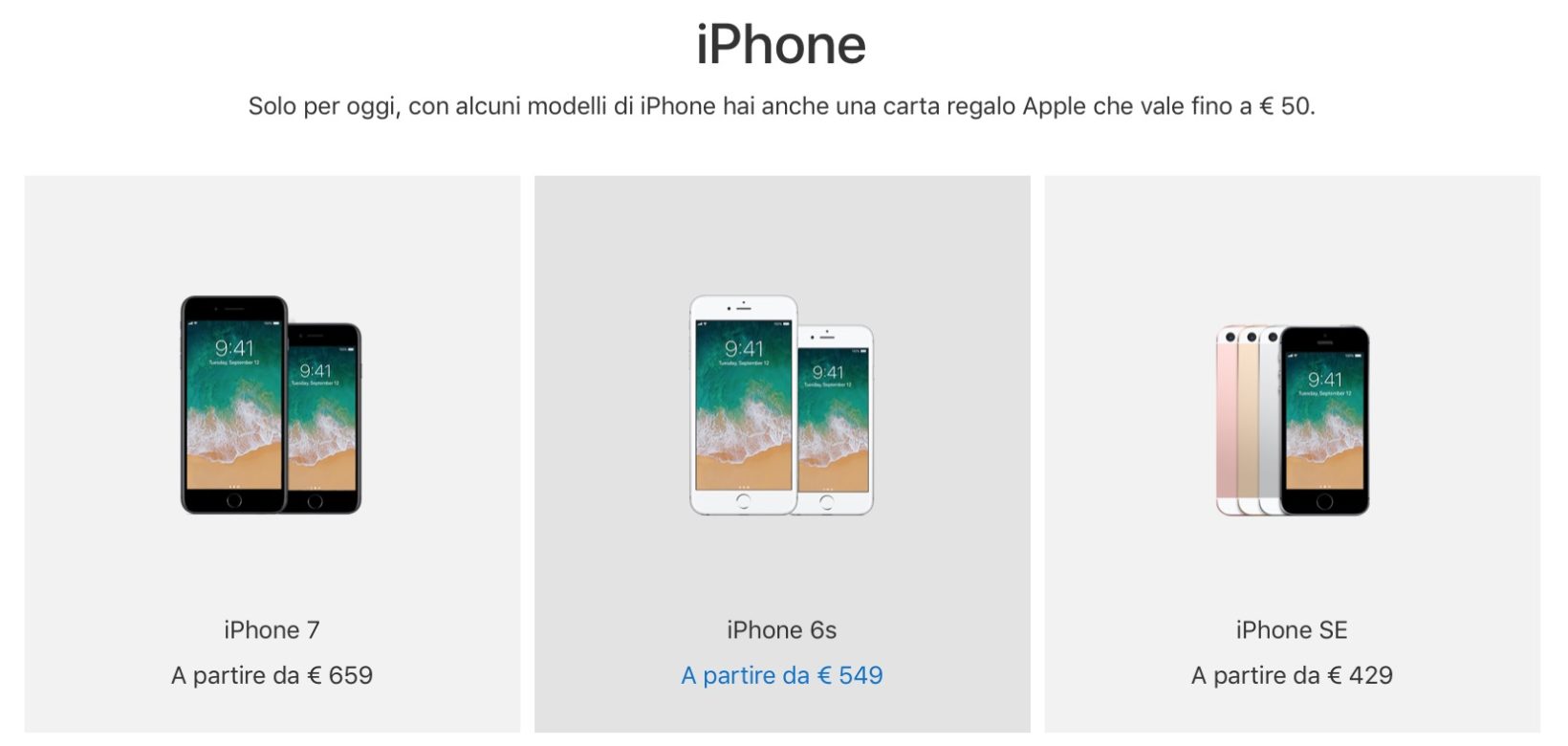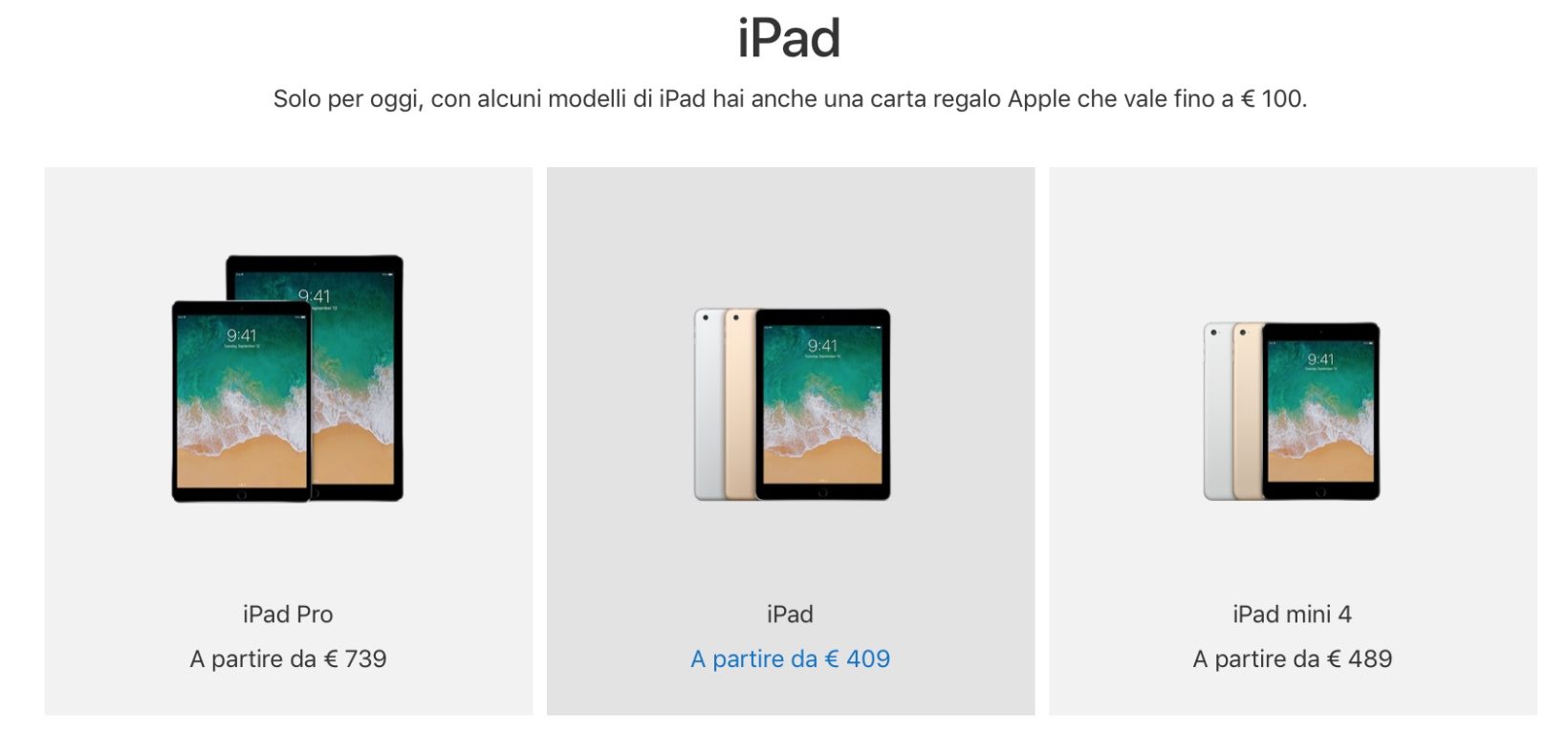 Comprando iPhone si ottiene una Apple Gift Card con importo fino a 50 euro, promozione valida acquistando iPhone 7 e iPhone 6s, invece acquistando iPad si ottiene una carta regalo con importo massimo di 100 euro: in questo caso i modelli che danno diritto a ricevere la gift card sono iPad Pro, iPad e anche iPad mini 4.