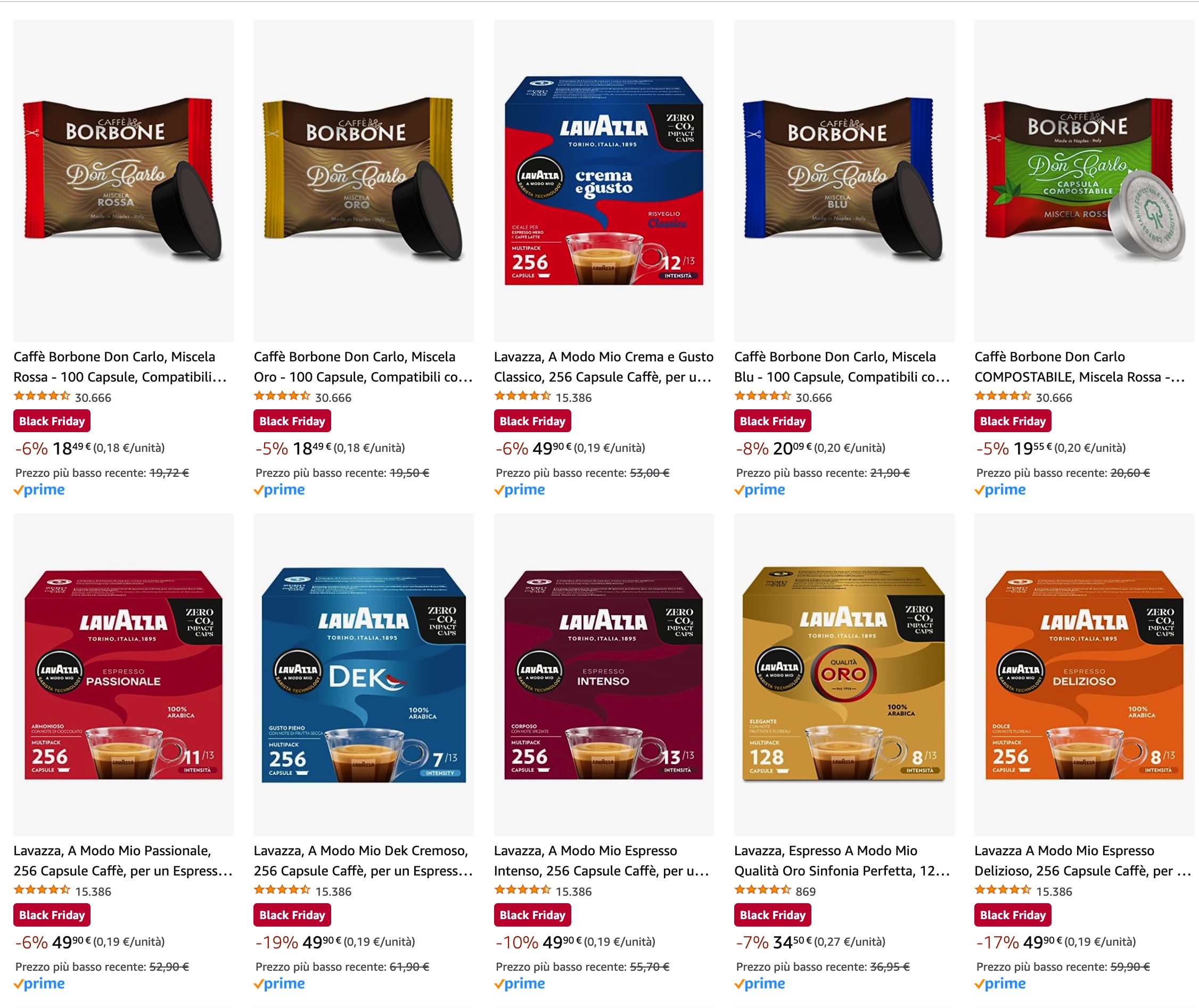 Durante gli sconti Black Friday non mancano mai le offerte promozionali sui caffè, un toccasana per chi lavora (e gioca) fino a notte fonda. Se, quindi, il vostro computer non si ferma mai ma anche se lee maratone con le serie TV sono la vostra ossessione e non vi volete perdere neppure un minuto anche durante la festa degli sconti d’autunno potete andare su Amazon e comprare con sconti molto tangibili rispetto ai prezzi di listino vari prodotti dei grandi marchi.