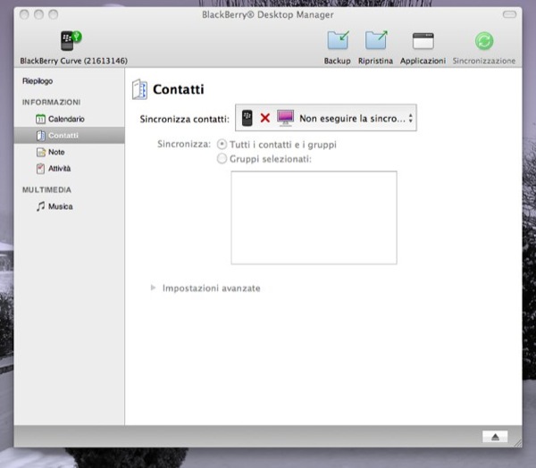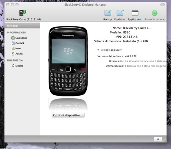 Le opzioni del BlackBerry Desktop Manager sono abbastanza essenziali se paragonate con quelle di iTunes, ma integrano quanto necessario per chiunque faccia un discreto uso del suo dispositivo RIM e desidera poterne gestire le potenzialità direttamente dal Mac.