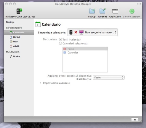 Tramite il software potremo facilmente sincronizzare i nostri contatti e il calendario fra il dispositivo RIM e la Rubrica Indirizzi iCal per Mac, in modo da tenere sempre aggiornati appuntamenti e contatti.