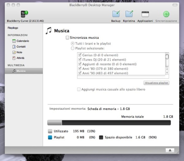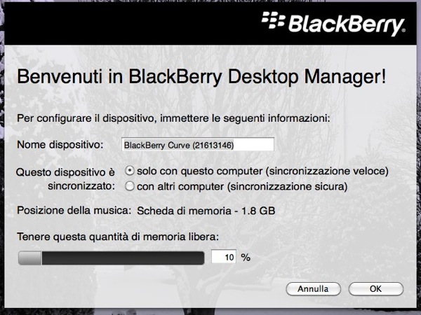 Una volta installato, vi sarà chiesto di riavviare il Mac, dopodiché potrete finalmente lanciare il software e connettere il vostro BlackBerry per la configurazione iniziale. Il Desktop Manager infatti vi permette di gestire più BlackBerry, scegliere se sincronizzare il dispositivo con uno o più computer e impostare un valore specifico di memoria libera, in rapporto alla scheda di memoria inserita.